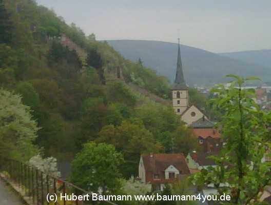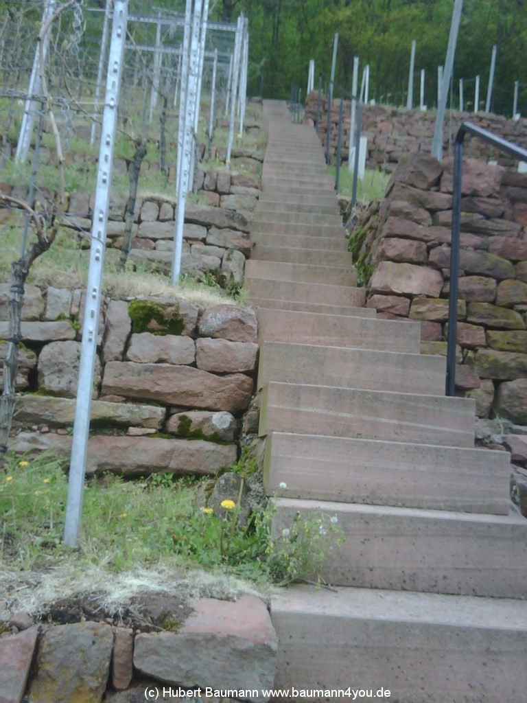 Den Rückweg nahmen wir über den Höhenweg und folgten auf etwa halber Strecke der Beschilderung über eine Treppe den Weinberg hinab auf den Churfrankensteig, der unterhalb des Tempels vorbei wieder am Freibad in Erlenbach ankommt.
