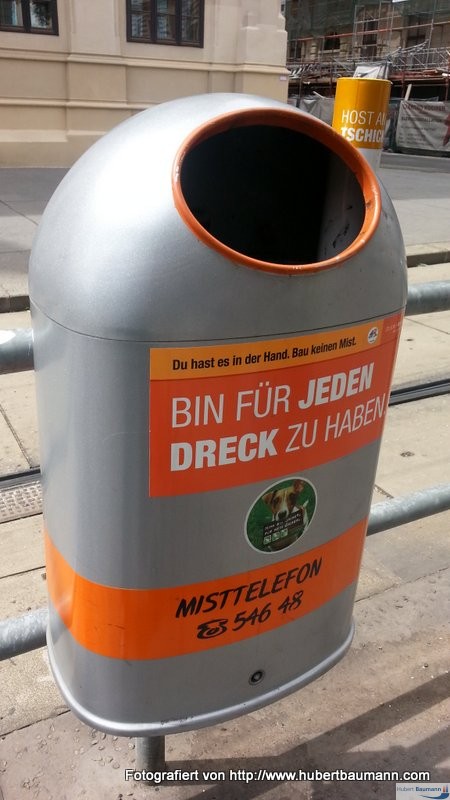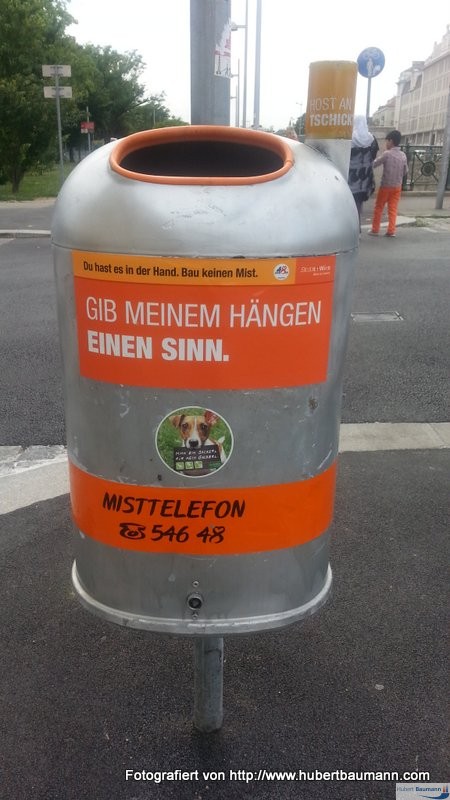 Mit diesen lustigen Abfalleimersprüchen versucht z. B. die Stadtreinigung der Stadt Wien ihren Bürgern die ordnungsgemäße Abfallentsorgung schmackhaft zu machen. Hier nur einige Beispiele: :-)