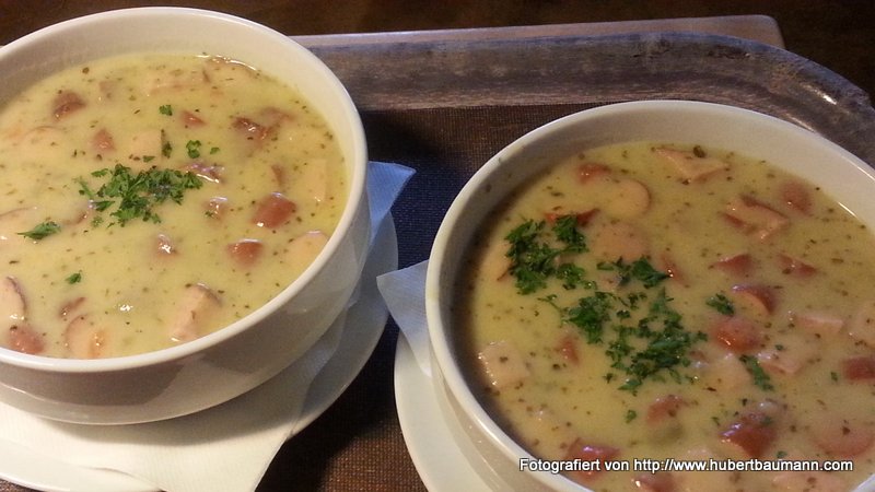 Im Bärenschlössle erwartete uns ein leckerer Bäreneintopf – eine Kartoffelsuppe mit verschiedenen Wurstsorten. Man könnte sagen „Alles, was die Küche an verschiedenen Sorten Wurst hergibt“, aber sehr lecker und sättigend. Bei Bäreneintopf und einem Weißbier konnten wir auch die halbe Stunde Gewitterregen gut überbrücken.