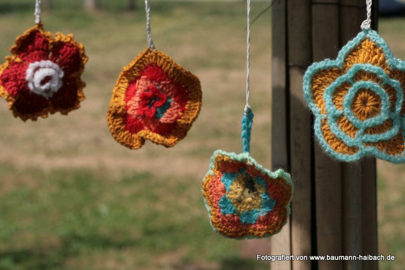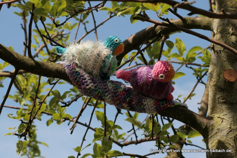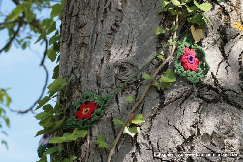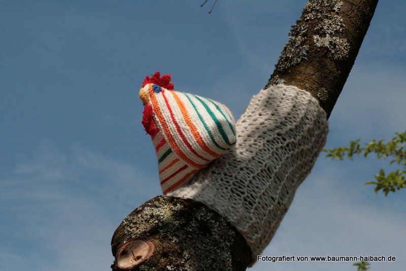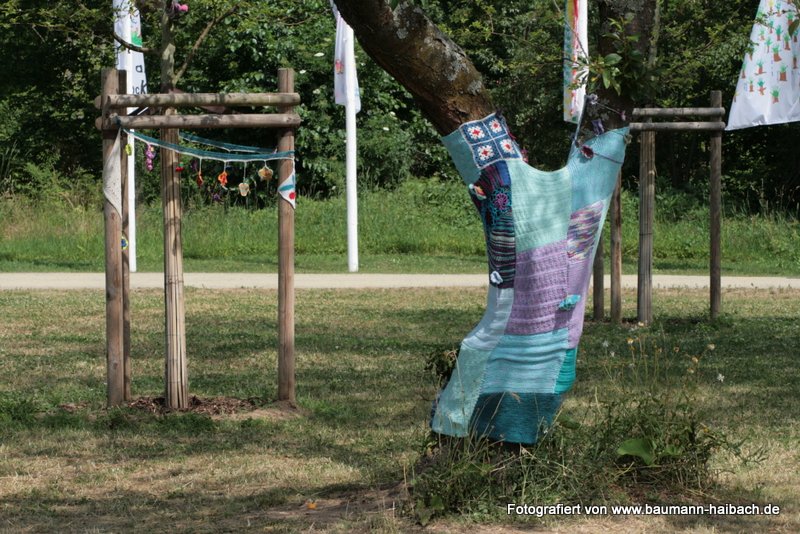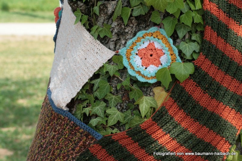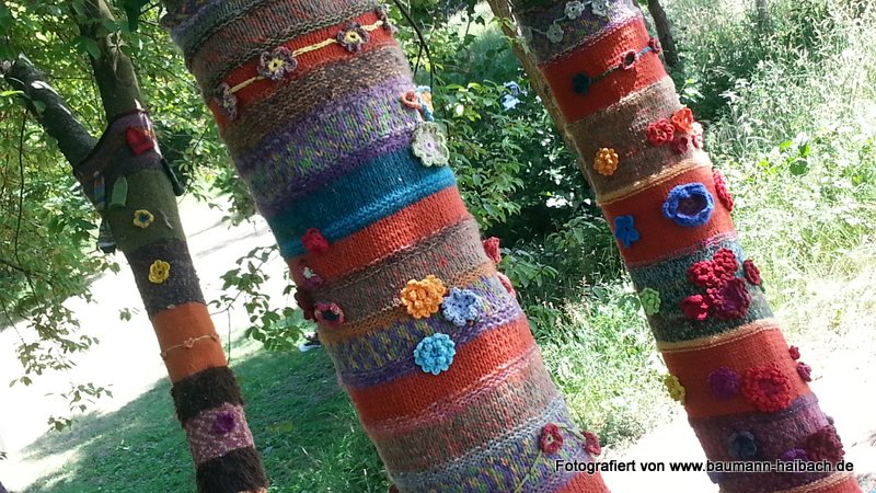 Der nächste Winter kommt bestimmt. Und so beginnt so mancher schon frühzeitig mit dem Stricken. Strickkunst und Assecoires rund um den Baum – entdeckt auf der Bayerischen Landesgartenschau 2015 in Alzenau.