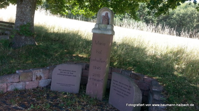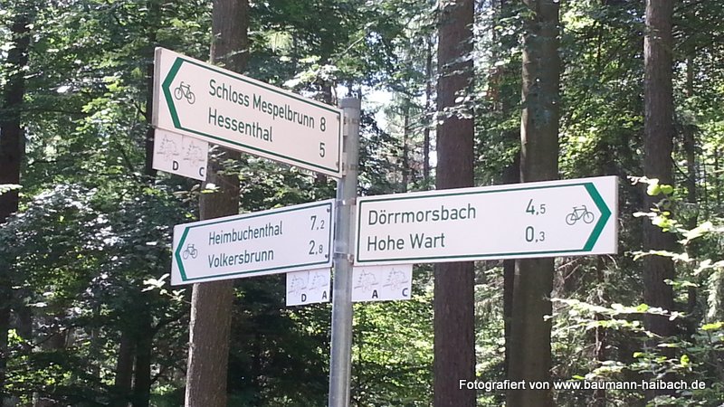 Gestartet sind wir in Haibach. Von dort am neuen Feuerwehrhaus vorbei über den Grünmorsbacher Sportplatz über Dörrmorsbach und Pfaffenberg zur Hohen Warte. Nach der Hohen Warte rechts in Richtung Volkersbrunn. Oberhalb von Volkersbrunn quert man die Fahrstraße und gelangt nach einigen Wald-Kilometern an den Leidersbacher Sportplatz. Nach dem Sportplatz an der Fahrstraße nach links und nach wenigen Metern rechts weiter auf der Höhe in Richtung Dornau. Dornau lässt man dann allerdings rechts liegen, bleibt immer oben und biegt dann nach einiger Zeit an einem großen Wegweiser wahlweise nach links (in Richtung Kleinwallstadt) oder rechts (in Richtung Sulzbach ab).