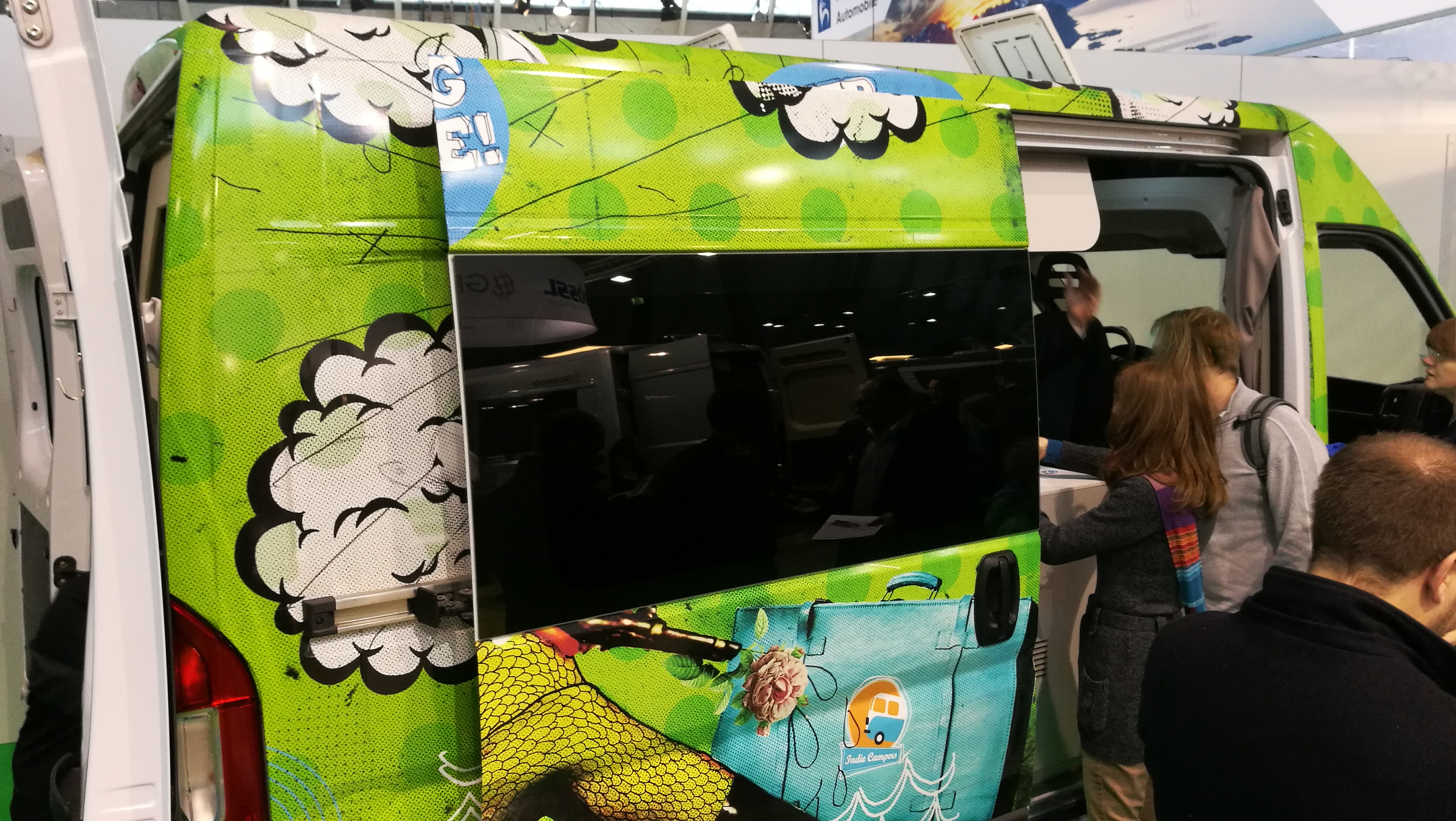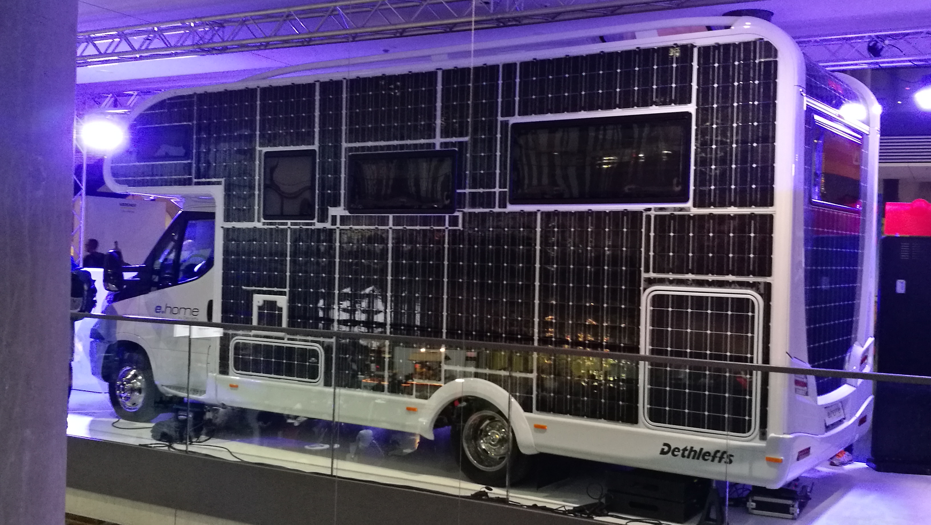 Dementsprechend wenig Muße blieb uns, uns an einzelnen Ständen wirklich mit Details zu beschäftigen. Ein Blogger-Kollege wies uns auf den Prototyp des Solarmobils hin, das im Eingangsbereich präsentiert wurde. Die Solarzellen, die den gesamten Außenbereich des Mobils schmücken, sorgen dafür, dass man im Fahrzeug jederzeit gut versorgt ist. Selbst ein Elektroherd, wie wir ihn von zu Hause gewohnt sind, kann gut mit Strom versorgt werden. Doch mal ehrlich: Möchtet ihr mit einem solchen Fahrzeug auf die Reise gehen? Der Zweck heiligt die Mittel, könnte man sagen. :-)