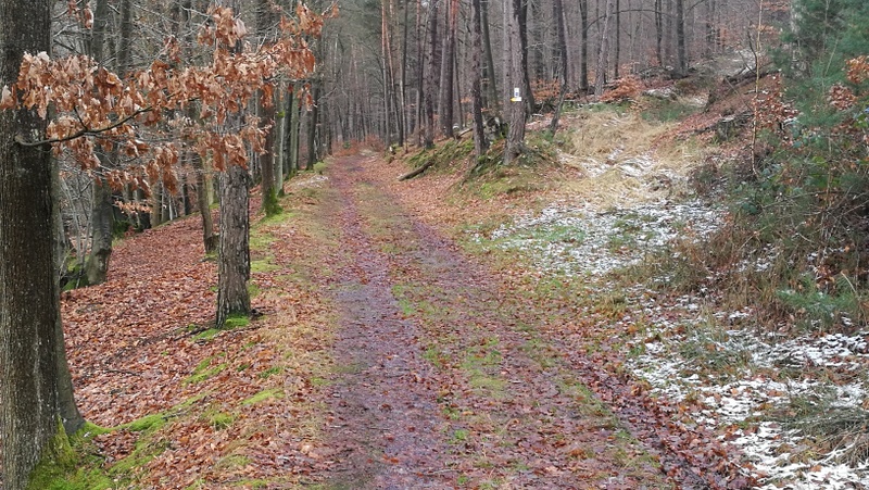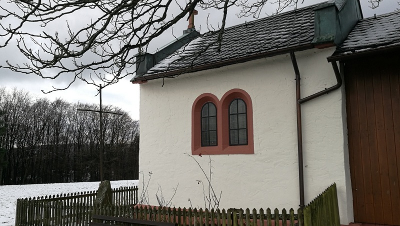 Nach den häufigen Regenfällen der vergangenen Wochen war der Weg den Berg hinauf rutschig und matschig und wir mussten unsere Schuhe nach der Tour einer Generalreinigung unterziehen. Es scheint überall, als habe der Boden mittlerweile aufgegeben, das viele Wasser überhaupt aufzunehmen. Von der Kapelle aus hat man eine herrliche Sicht über den Spessart und den Odenwald, der heute lediglich von einer dicken Wolkendecke über uns etwas getrübt wurde.