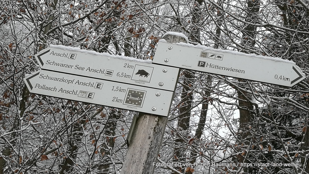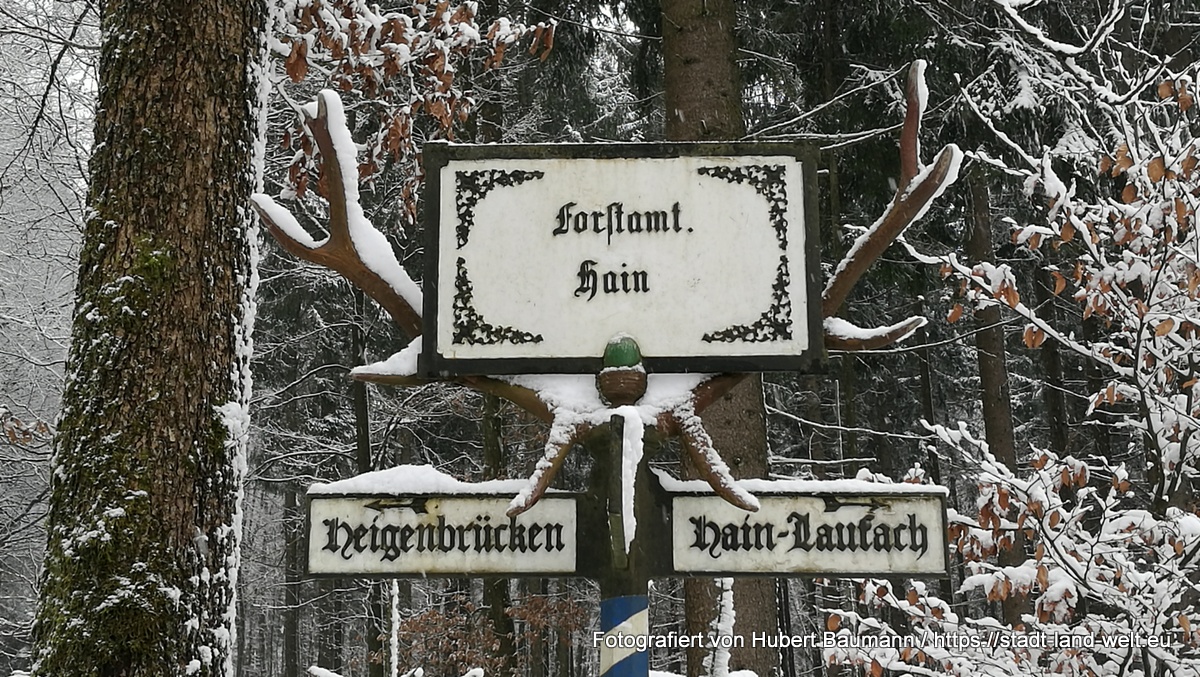 Wir verweilten noch einige Minuten auf der Aussichtsplattform und traten dann unseren Rückweg in Richtung Heigenbrücken an, der von nun an steil bergab führen sollte. Wieder verbunden mit einigen kleineren Sehenswürdigkeiten, wie beispielsweise den historischen Wegweiser mit Hirschgeweih am Parkplatz „Hirschhörner“