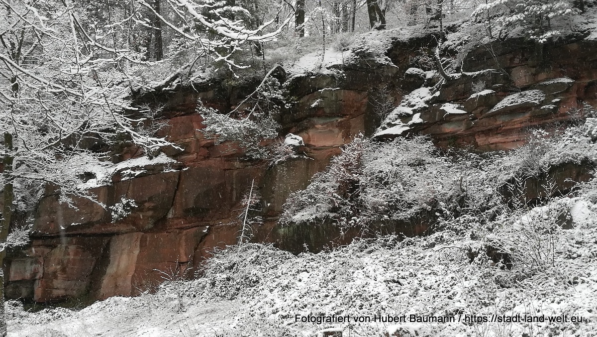 Nach etwa einer 3/4 Stunde erreichen wir dann den alten Sandsteinbruch und den den Aussichtspunkt „Pollasch“ auf der gegenüberliegenden Straßenseite, wo wo aus man (normalerweise) einen herrlichen Blick in die Landschaft haben sollte. Doch heute?