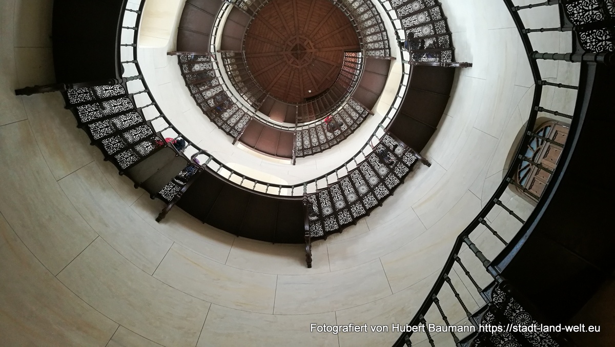 Über eine freitragende Wendeltreppe (Vorsicht, man sollte schwindelfrei sein) geht es in 154 Stufen hinauf zum Turm. Wie bereits erwähnt, war unser Blick dort oben von einem Regenschauer getrübt. Ein paar Aufnahmen wollten wir euch aber dennoch nicht vorenthalten.