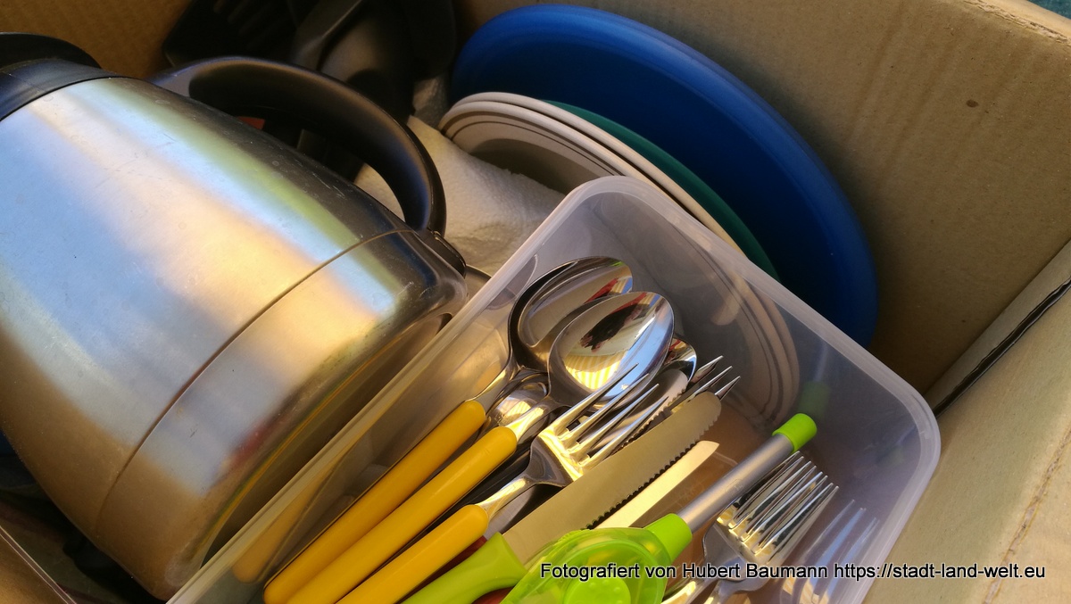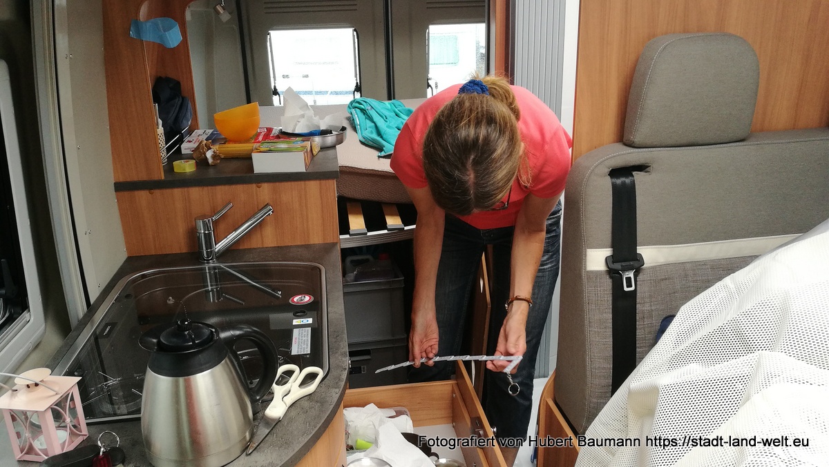 Und somit saßen wir dann auch inmitten unserer Kisten in unserer rund 10 qm großen mobilen Ferienwohnung. Mit viel System und hin- und herschieben hat das Einräumen dann aber doch gut geklappt und wir konnten den Tag auf dem gegenüberliegenden Stellplatz unseres Händlers bei einem Gläschen Sekt ausklingen lassen.
