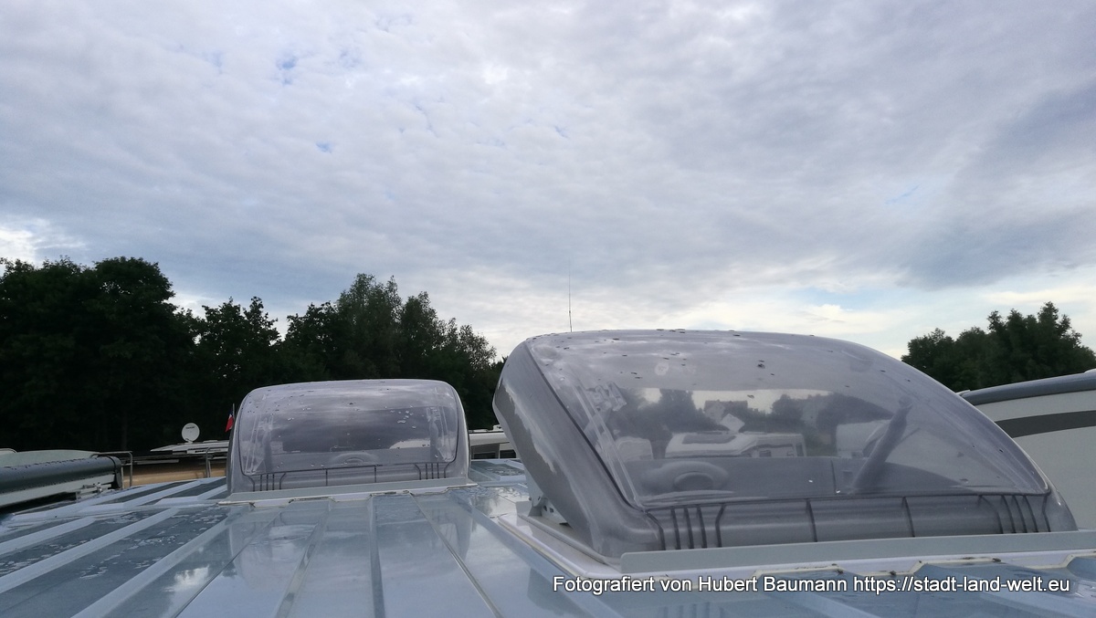 Etwas ungeplant verlief die Einweisung in unser neues Gefährt. Denn diese endete mit einer ausführlichen Dichtigkeitsprüfung unserer Dachfenster – sprich mit Regenwetter, das uns über die beiden Tage, die wir in Stralsund verbrachten, auch weiter begleitete. Und so hieß es für uns: Alle gepackten Kisten im Eiltempo aus dem Leihwagen in den Pössl, um den Leihwagen termingerecht abliefern zu können.