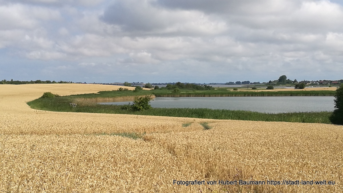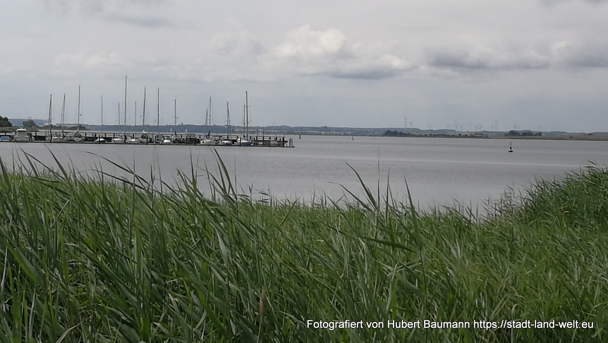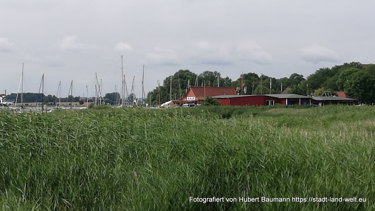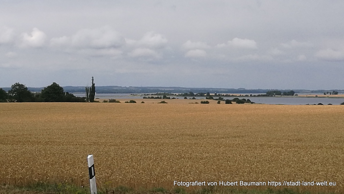 Am kommenden Tag ging es dann nochmal los. Wir wollten noch ein paar Stunden in der Stadt bzw. in der Region verbringen. Schließlich waren wir nicht auf der Flucht und es war nirgends jemand, der auf uns wartete. Natürlich auch wieder der Nase nach. Und so fanden wir direkt im Hafenbereich ein Hinweisschild auf einen Radweg auf die etwa 15 km entfernte Insel Poel. Der Weg führte uns zunächst ein ganzen Stück durch die Stadt und Industrieanlagen im Hafenbereich (touristisch nicht sonderlich attraktiv), wechselte aber nach etwa 5 km in eine Landschaft, mit vielen Feldern, Schilf und Wasser.