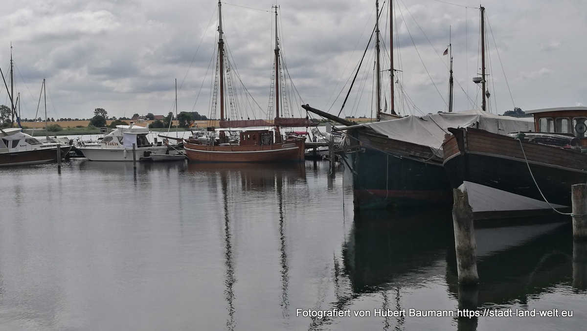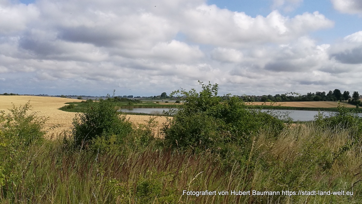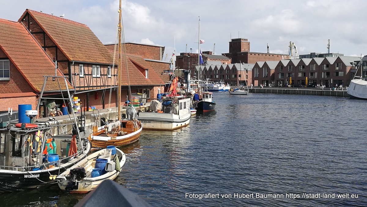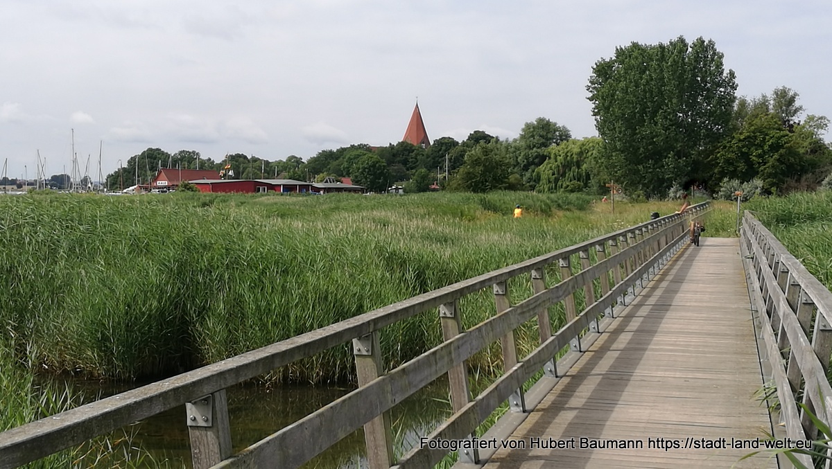 Am kommenden Tag ging es dann nochmal los. Wir wollten noch ein paar Stunden in der Stadt bzw. in der Region verbringen. Schließlich waren wir nicht auf der Flucht und es war nirgends jemand, der auf uns wartete. Natürlich auch wieder der Nase nach. Und so fanden wir direkt im Hafenbereich ein Hinweisschild auf einen Radweg auf die etwa 15 km entfernte Insel Poel. Der Weg führte uns zunächst ein ganzen Stück durch die Stadt und Industrieanlagen im Hafenbereich (touristisch nicht sonderlich attraktiv), wechselte aber nach etwa 5 km in eine Landschaft, mit vielen Feldern, Schilf und Wasser.