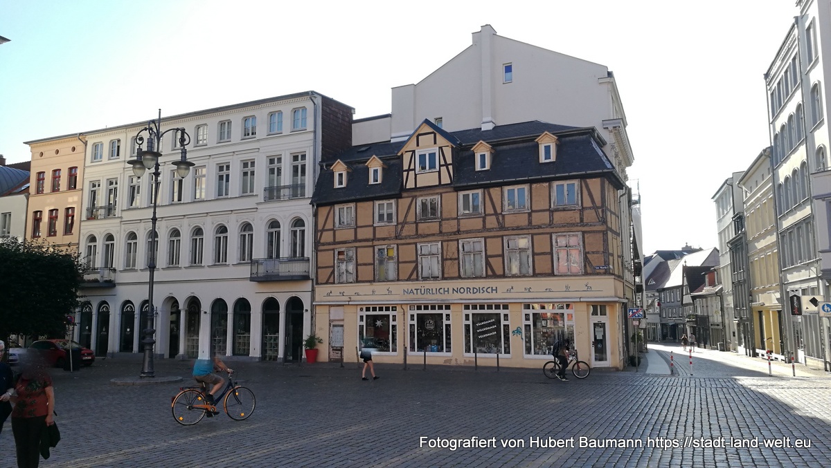 Vorbei an einer Schrebergartensiedlung, durch ein kleines Waldstück und über eine Ausfallstraße gelangten wir in ca. 10 Minuten in die Schweriner Innenstadt. Wir hatten es uns mittlerweile angewöhnt, unsere Stadtbesichtigungen mit dem Fahrrad zu machen, und nur bei Bedarf das Fahrrad abzustellen und zu Fuß weiterzugehen. Man kommt einfach schneller voran, überbrückt langweilige Streckenabschnitte schnell und gewinnt viel schneller einen Überblick über die wichtigsten Impressionen. Und man (bzw. konkret ICH) verliegt nicht so schnell die Lust.