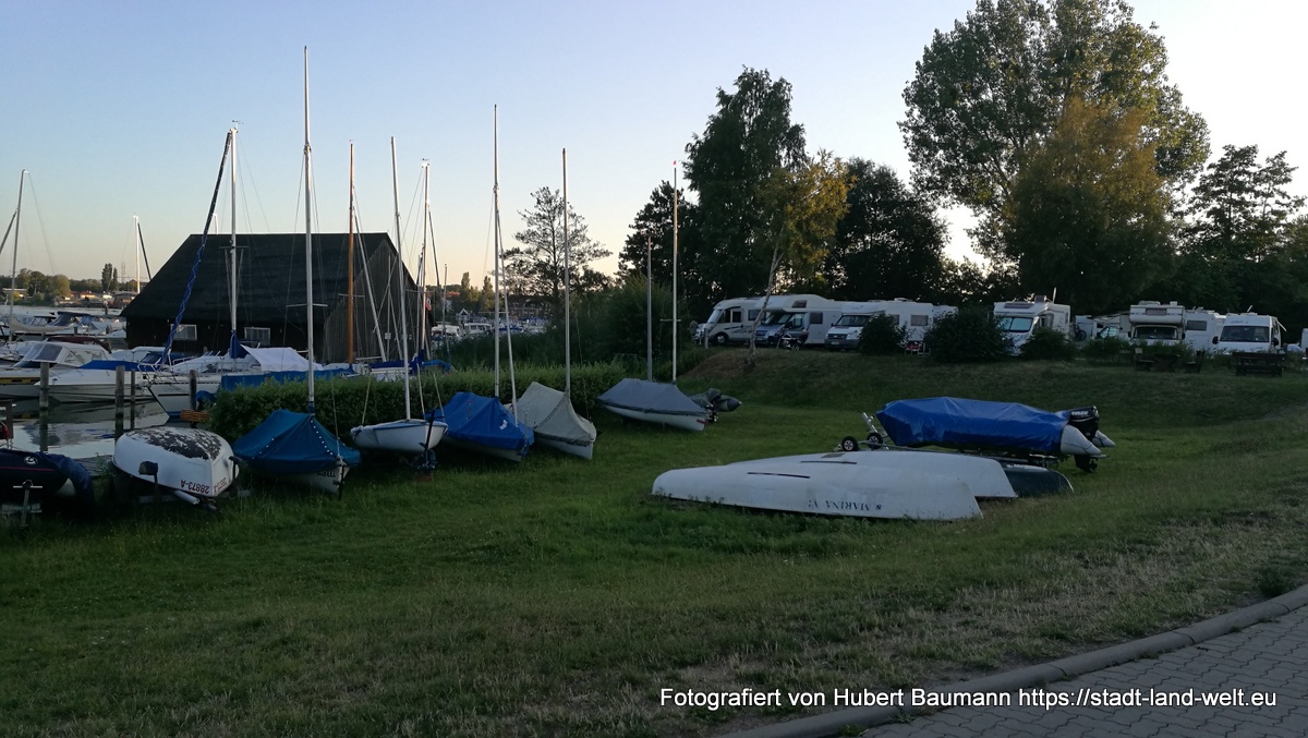 Von Wismar ging es nun am Sonntag nachmittag weiter in die etwa 30 km südlich gelegene Landeshauptstadt Mecklenburg-Vorpommerns: Schwerin – wunderschön gelegen inmitten der Mecklenburgischen Seenplatte. Dementsprechend mussten wir unser Lager natürlich an einem dieser Seen aufschlagen. Unsere Wahl fiel auf den Platz Marine Nord am Heidensee. Eingecheckt wurde …. beim Hafenmeister. Außer einer guten Lage direkt am See, den wir von unserem Standplatz aus leider nur zwischen anderen Womos durchblicken sahen, war der Platz aber insgesamt eher einfach gehalten. Wiese ohne Stellplatzabgrenzung über Sanitäranlagen und Entsorgung.