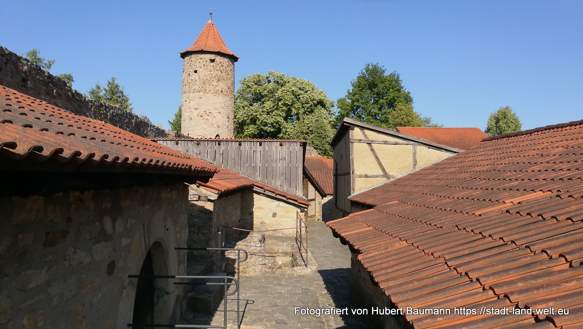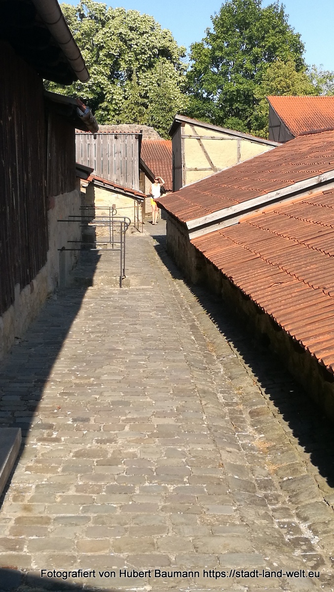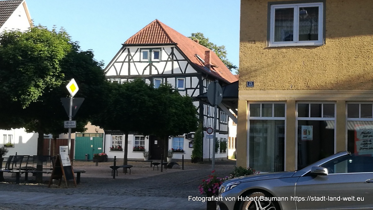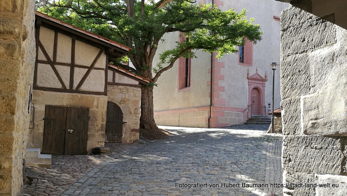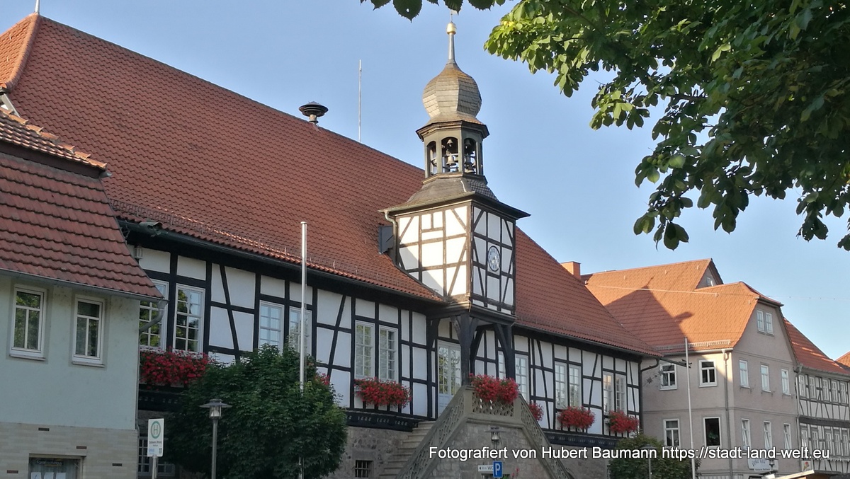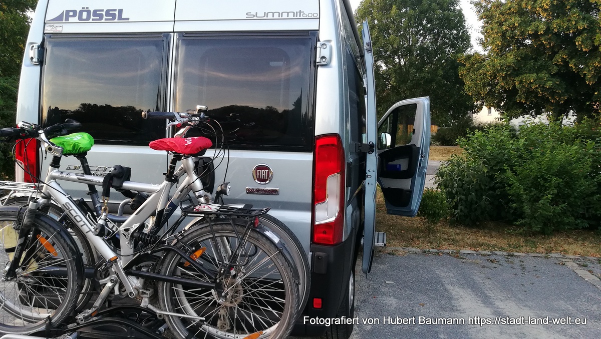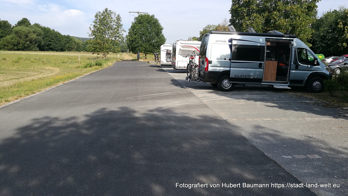 Eigentlich haben wir den Besuch dieses idyllischen Städtchens „vor der Rhön“ ja nur einem Zufall zu verdanken. Genauer gesagt: dem Zufall eines defekten Rücklichts an unserem Fahrradträger und einem älteren Herrn, der uns darauf hinwies und mit dem wir ins Gespräch kamen. Auf der Suche nach einer Einkaufsgelegenheit im Ort stießen wir dann auf einige idyllische Häuser sowie auf einen kleinen Stellplatz am Ortsausgang und entschlossen spontan, dort für eine Übernachtung unser Lager aufzuschlagen. Der Stellplatz ist für 3 EUR pro Nacht sicherlich für jedermann erschwinglich.