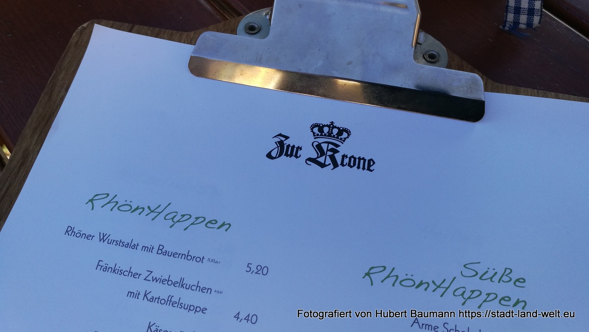 Viel Gesprächsbedarf gab es auch im Gasthaus Krone zu den Rhönhappen. Der Wirt erklärte den Gästen an den Tischen in Ruhe die Idee und die Bedeutung seiner Rhönhappen nach dem „Tapa-Vorbild“. Mit kleinen Gerichten in einer Preisklasse zwischen 4 und 7 Euro kann man sich dort bequem durch die fränkische Küche futtern und die unterschiedlichen Spezialitäten der Region kennen lernen. Ursprünglich hatten wir für diesen Abend „Selbstversorgung“ geplant und hatten uns auch im Supermarkt schon entsprechend eingedeckt. So sieht es aus, wenn man von jemandem einen Tipp bekommt und dann auf ein schnelles Bier mal dort vorbeischaut: