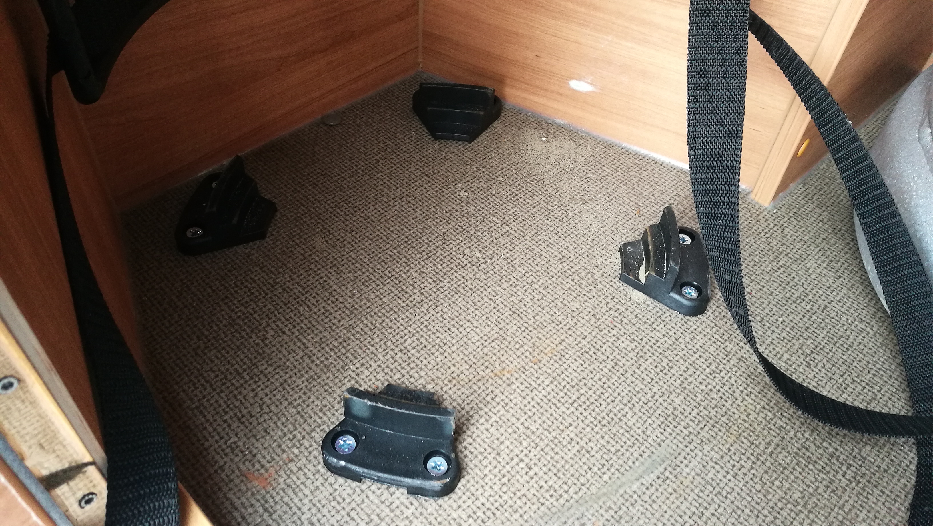 Probleme zeigten sich beim ersten Gasflaschentausch mit den Flaschenhalterungen am Boden. Der Händler hatte es beim ersten Mal irgendwie hingekriegt eine Flasche dort wackelfrei zu platzieren. Doch beim ersten Tausch waren die Dinger einfach nicht mehr rein zu kriegen. Nach zahlreichen Fehlversuchen, etlichem Fluchen und viel Schweiß (ja, die Dinger sind ja nicht so leicht), gab es nur eine Lösung: Halterungen abschrauben, Schablone basteln und die Halterungen neu befestigen. Jetzt gleiten die Flaschen einfach so in die Halterungen und stehen nach dem Verzurren bombenfest. Die hinteren Halterungen mussten um ca. 1 cm nach vorne, bei den vorderen waren es immerhin ca. 2 cm. Möglicherweise ist der relativ dicke Rand am Boden der Alu-Gasflaschen der Grund für diese erforderliche Korrektur.