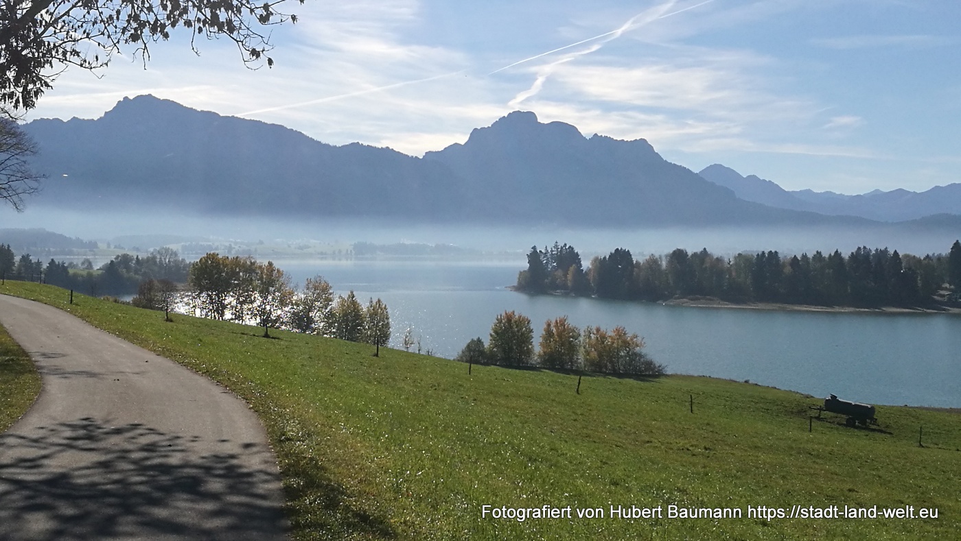 Etwas enttäuschend war auch der erste Teil der Strecke, die uns teilweise abseits des Sees und entlang an der Straße führte. Wer noch etwas mehr Zeit hat und sich den Tag komplett dafür Zeit nehmen kann, kann auf der Route auch noch einen kleinen Abstecher zum Hopfensee und zum Bannwaldsee machen.