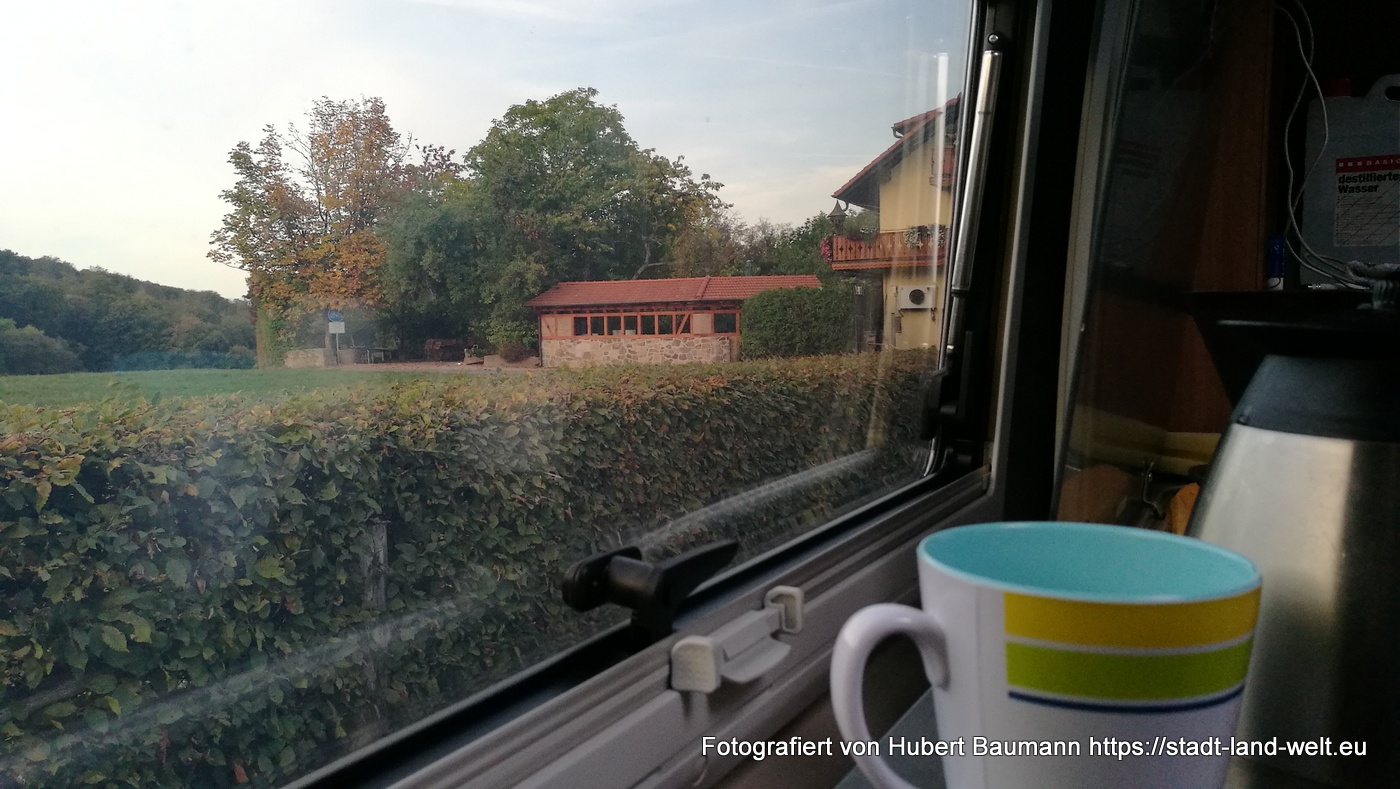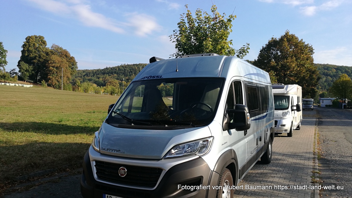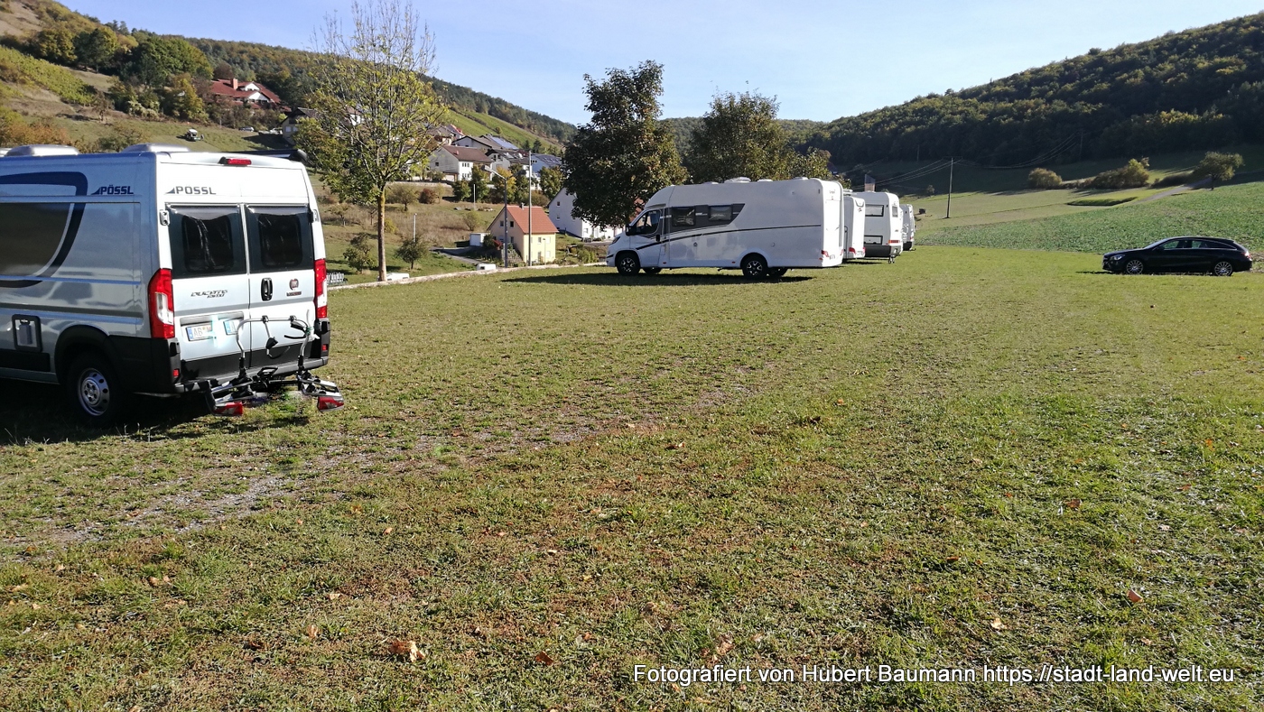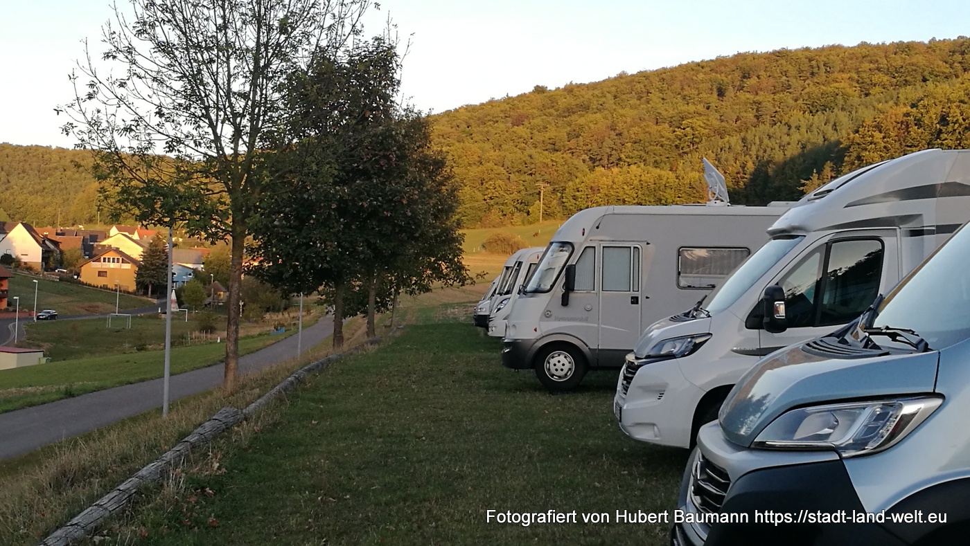 Diese Gemeinde (Wirmsthal in der Rhön / Nähe Hammelburg) hat noch keinen eigenen offiziellen Stellplatz ….. möchte aber in absehbarer Zeit einen einrichten. Auf einem großen Parkplatz am Sportplatz darf man dort aber heute schon stehen. Keine Infrastruktur wie Strom, Wasser etc. vorhanden, dafür auch kostenlos und absolut genial gelegen. Bei der Abreise gab es von der Gemeinde noch einen kleinen Fragebogen, was man sich denn von seinem künftigen Stellplatz wünscht: