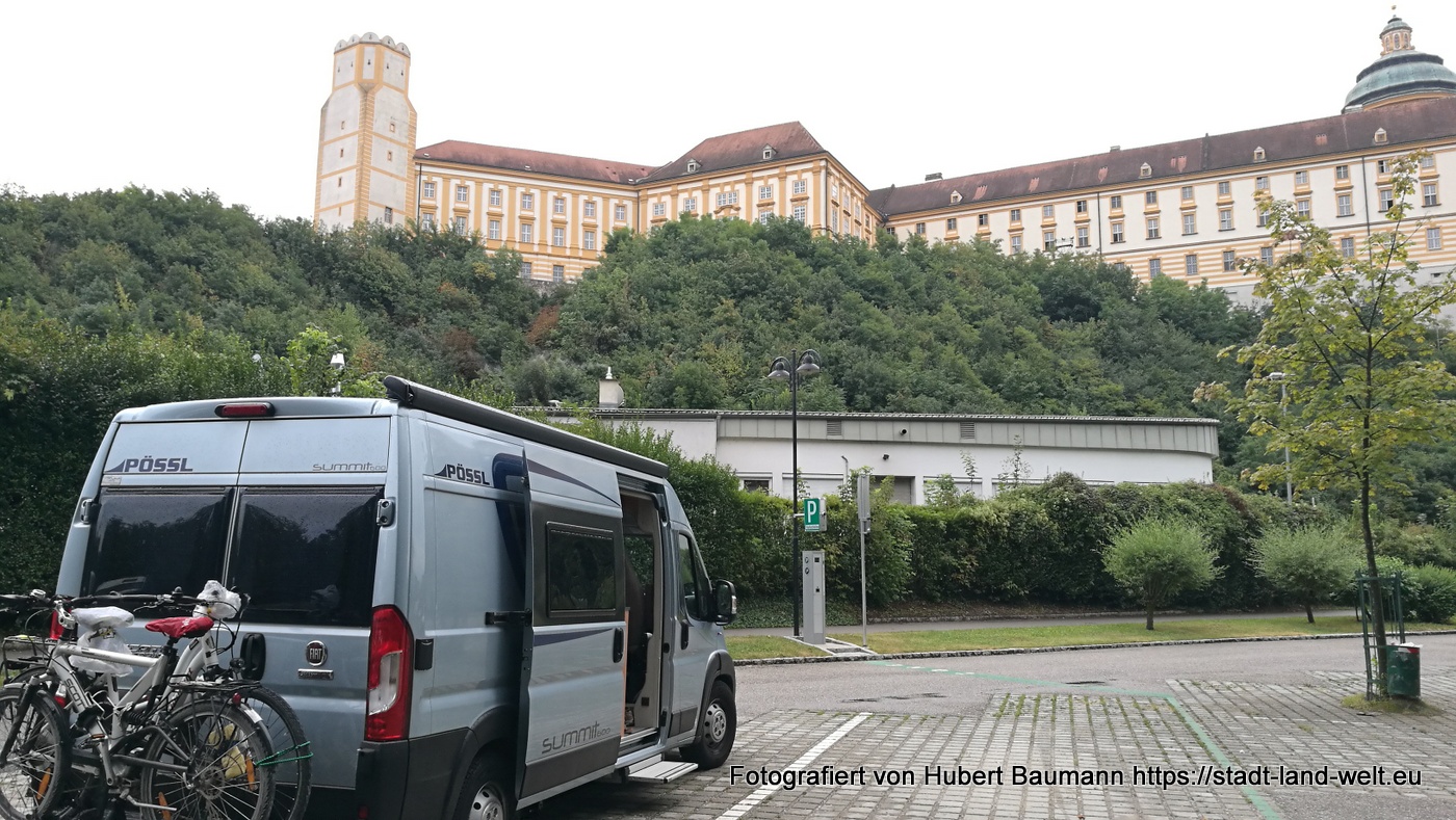 Stellplatz für 4 – 5 Mobile in Melk an der Donau (Niederösterreich) am Rande eines Parkplatzes. Zentrum ca. 300 m zu Fuß. Preis pro 24 Stunden: 5,00 EUR. Ver- und Entsorgung sowie Strom an einer zentralen Säule: