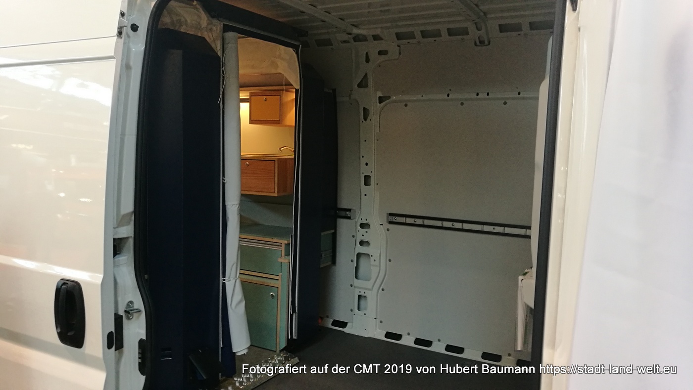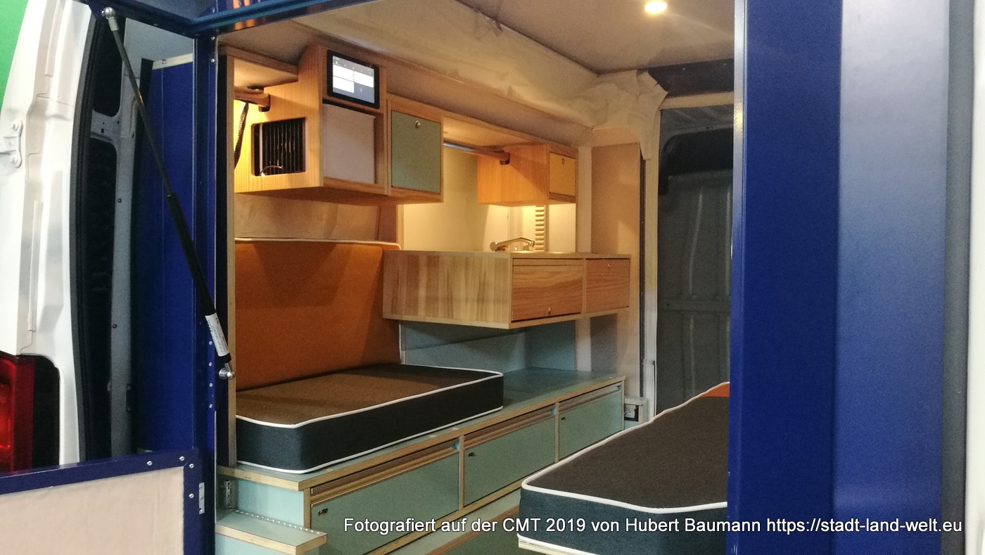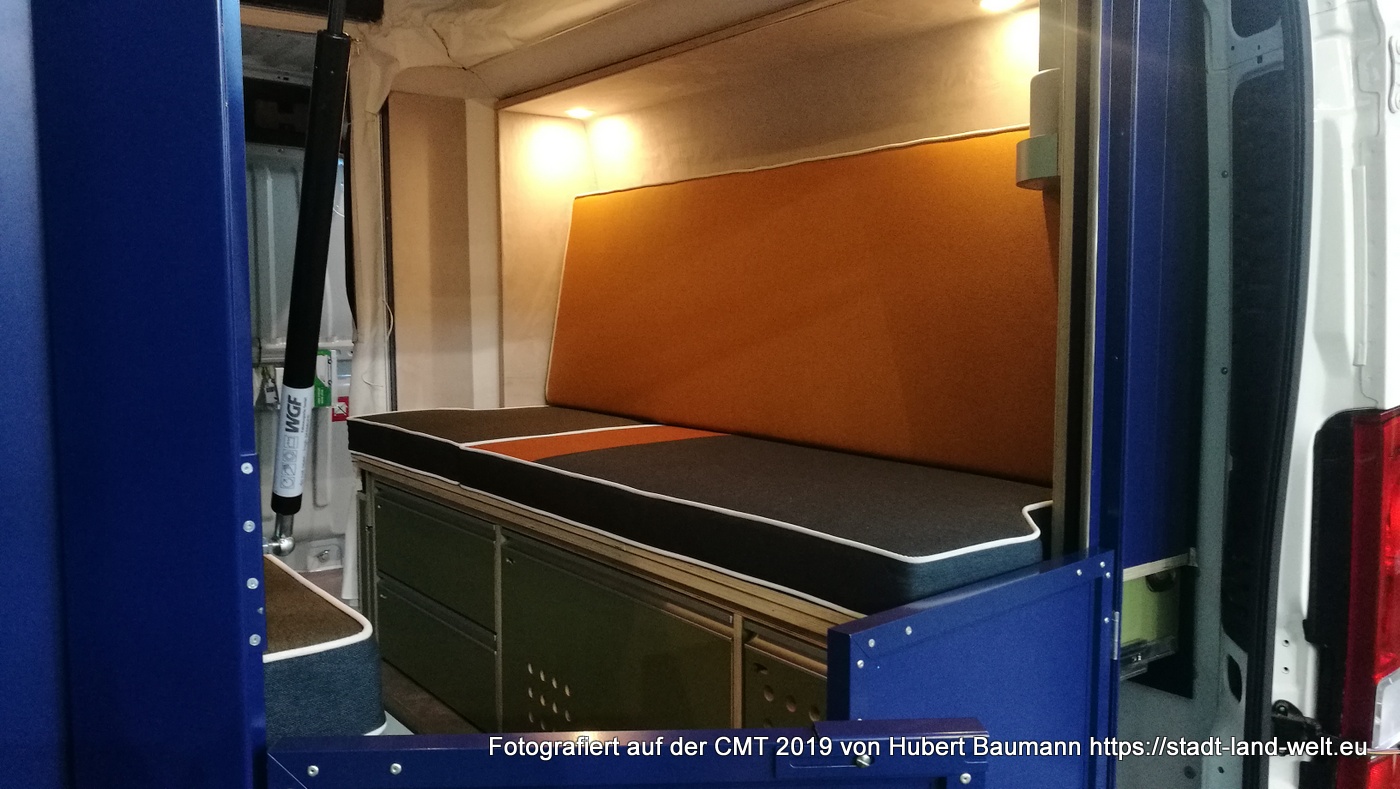 Wie man einen gewöhnlichen Kastenwagen in 5 Minuten in ein reisetaugliches Wohnmobil verwandelt, präsentierte mir Jörg Kortmann, Erfinder von PlugVan, in Halle 7. Ein fertiges Wohnmobil-Modul wird einfach über die Hecktüre in den Kastenwagen eingeschoben. 2 Meter Länge misst das Modul und lässt damit im Fahrzeug noch ausreichend Platz für andere Utensilien.