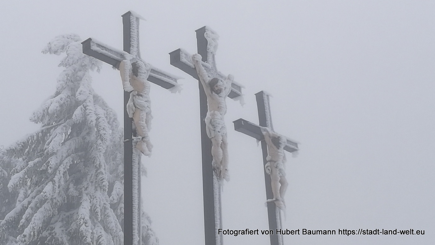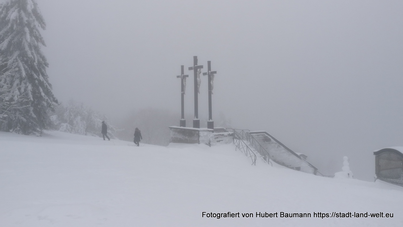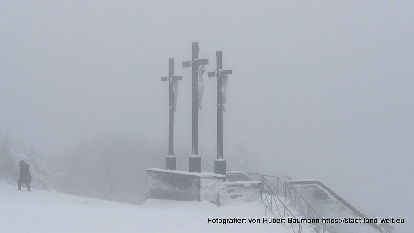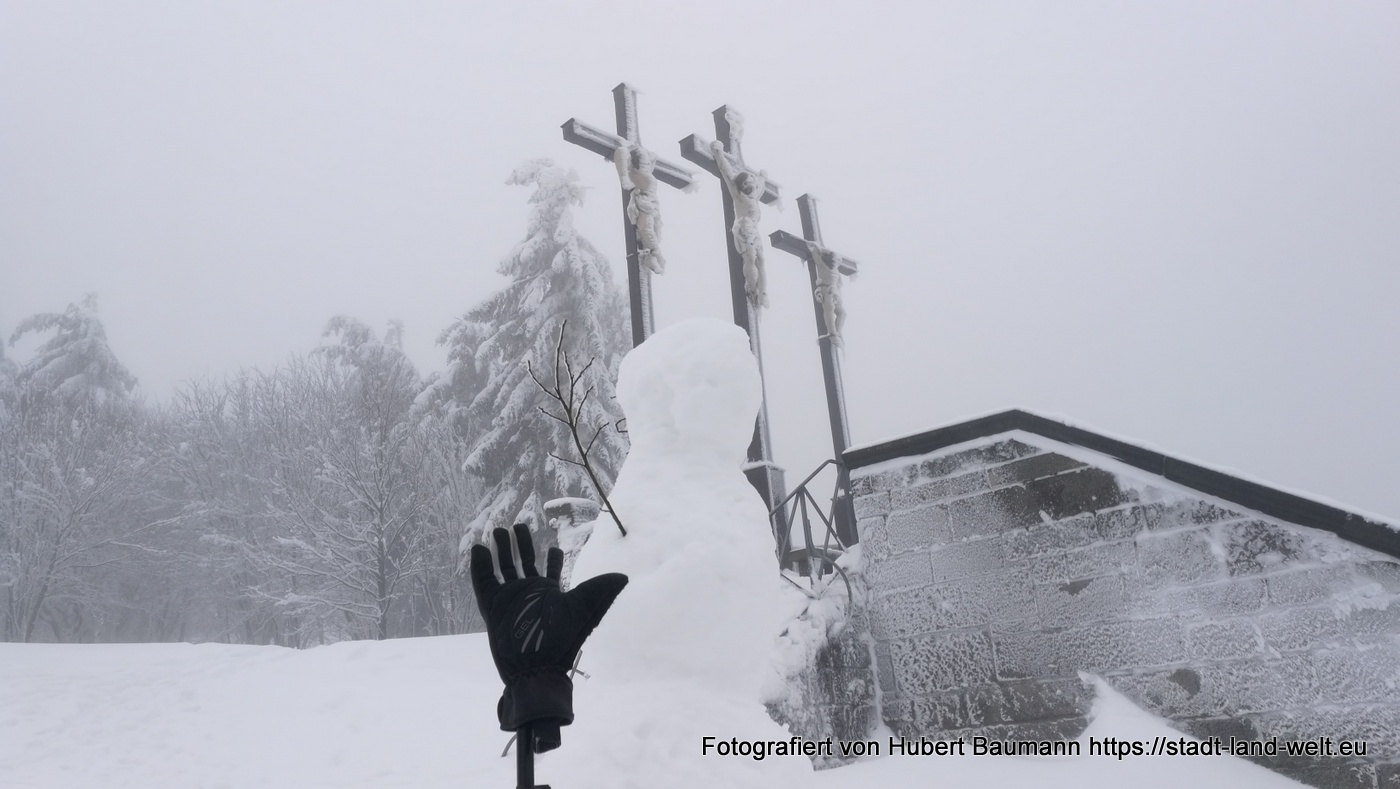 Bei unserer Tour am kommenden Vormittag begleitete uns nicht nur der Nebel. Es setzte auch leichter Schneefall ein. Vorbei an der Gemündner Hütte ging es den Berg hinauf zum Gipfelkreuz des Kreuzberges und weiter zur Kreuzigungsgruppe.
