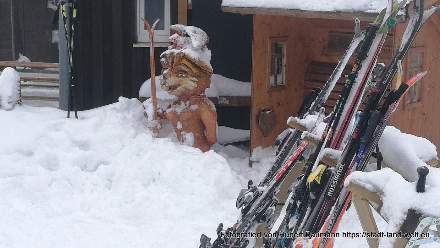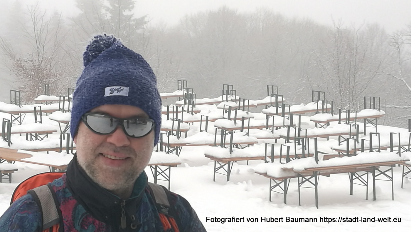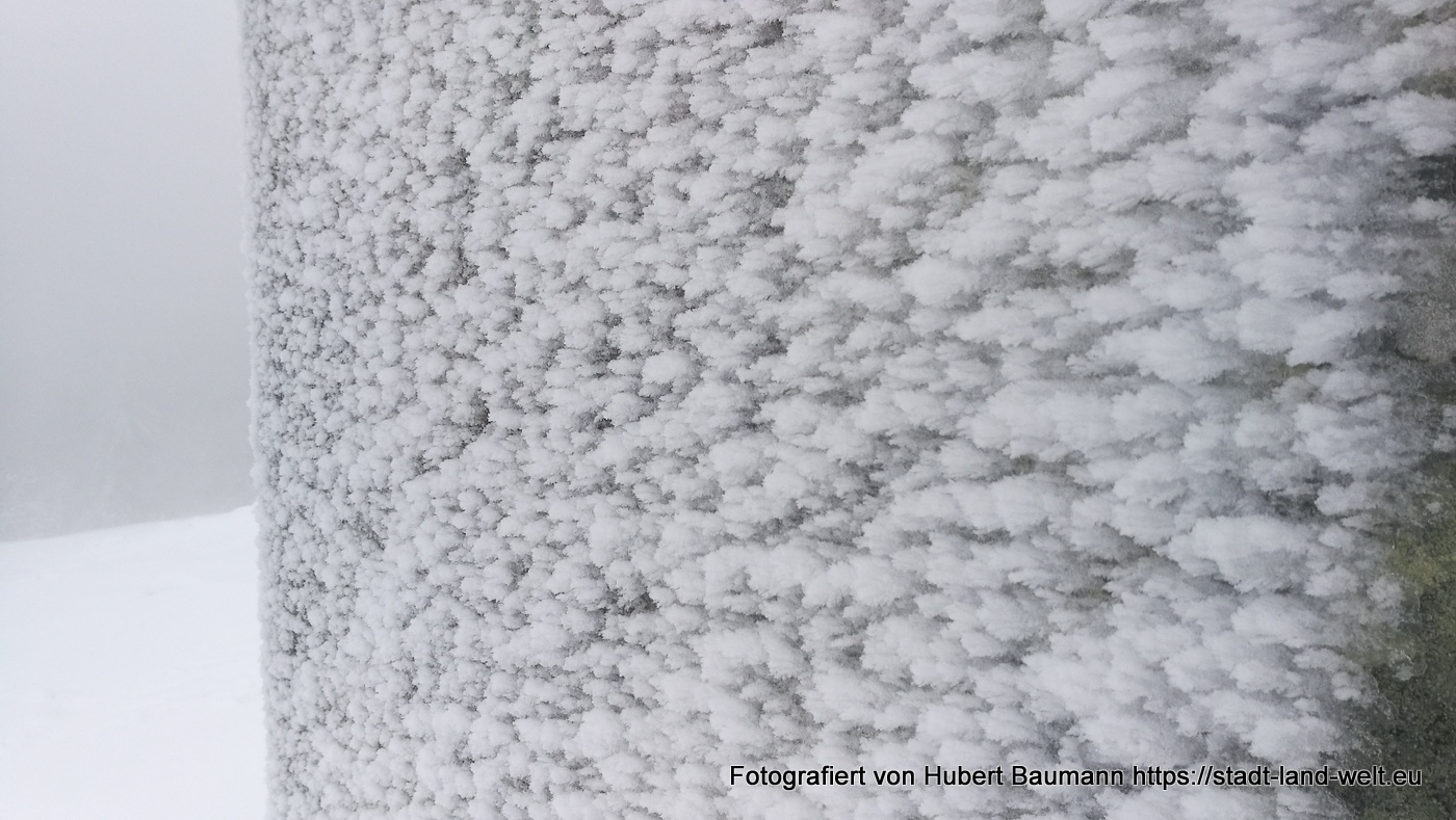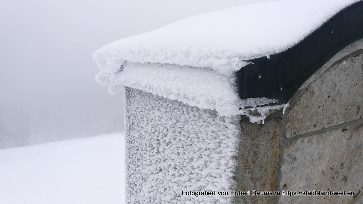 Bei unserer Tour am kommenden Vormittag begleitete uns nicht nur der Nebel. Es setzte auch leichter Schneefall ein. Vorbei an der Gemündner Hütte ging es den Berg hinauf zum Gipfelkreuz des Kreuzberges und weiter zur Kreuzigungsgruppe.