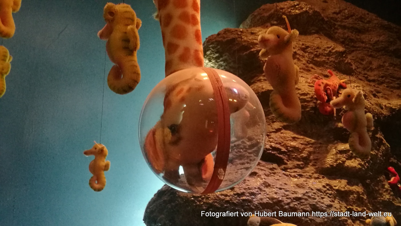 Unser Weg im Steiff-Museum führte uns zunächst in einem kleinen Raum los, in dem uns in wenigen Worten die Steiff-Geschichte präsentiert wurde. Danach ging es auch schon in die Teddybären-Werkstatt, wo der Teddybär Knopf und seine Freundin Frieda bereits auf uns warteten. In einer aufwendigen Animation schickte man uns in einem offenen Aufzug über mehrere Stockwerke auf Weltreise um die Teddybären zu suchen.