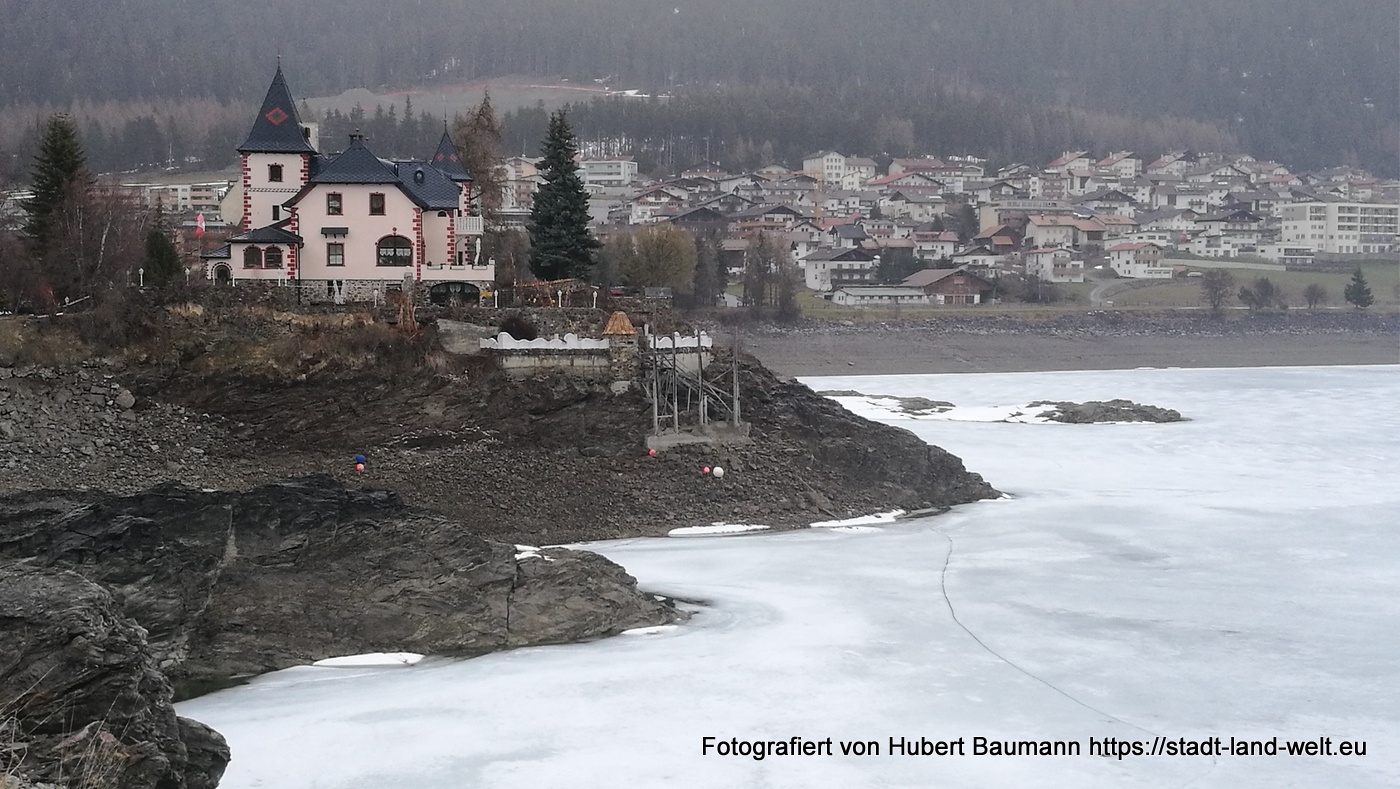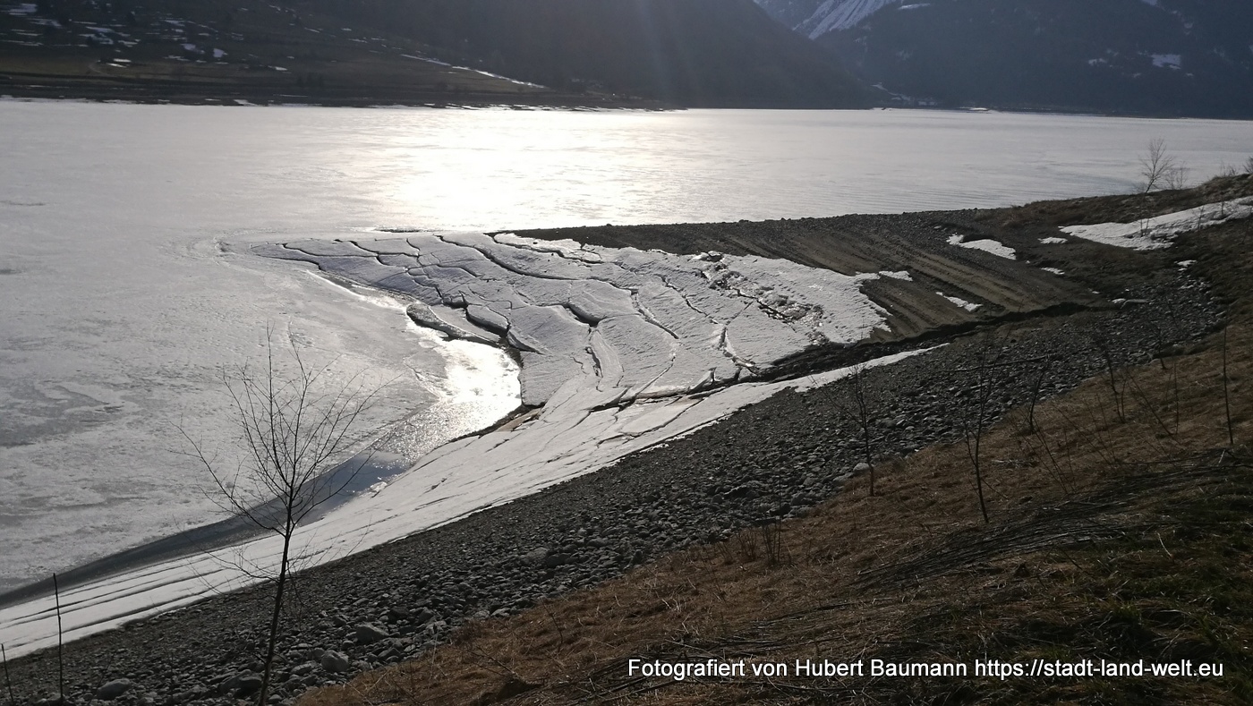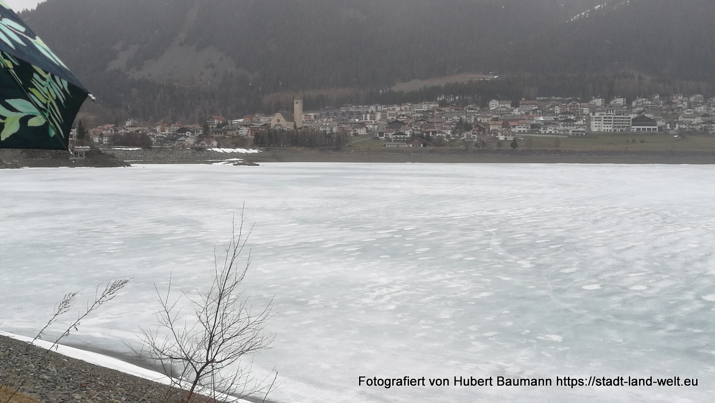 Bei unserer Ankunft um 13:30 waren 3 Womos auf dem Platz. Der Reschensee ist bis auf wenige Randbereiche noch zugefroren. Am Schönebenlift zur Skipiste war noch reger Betrieb.