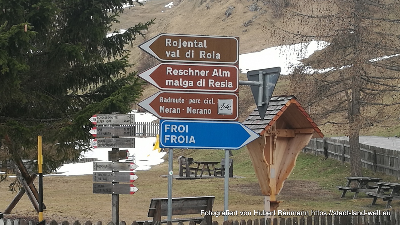 Dienstag: Der Morgen überraschte uns am Reschenpass mit etwas Sonne, aber auch mit vielen dicken Wolken. Noch ein kurzer Plausch mit unseren Nachbarn und die Fahrt ging weiter durch den Vinschgau und das Reschental in Richtung Meran. Als primäre Anlaufstelle hatten wir uns den Caravan-Stellplatz Schneeburghof in Dorf-Tirol ausgesucht. Da der Platz sehr begehrt zu sein scheint und dort keine Reservierung vorgenommen werden, hoffen wir natürlich auf einen guten Stellplatz. Doch dazu mehr im nächsten Beitrag (folgt in Kürze).