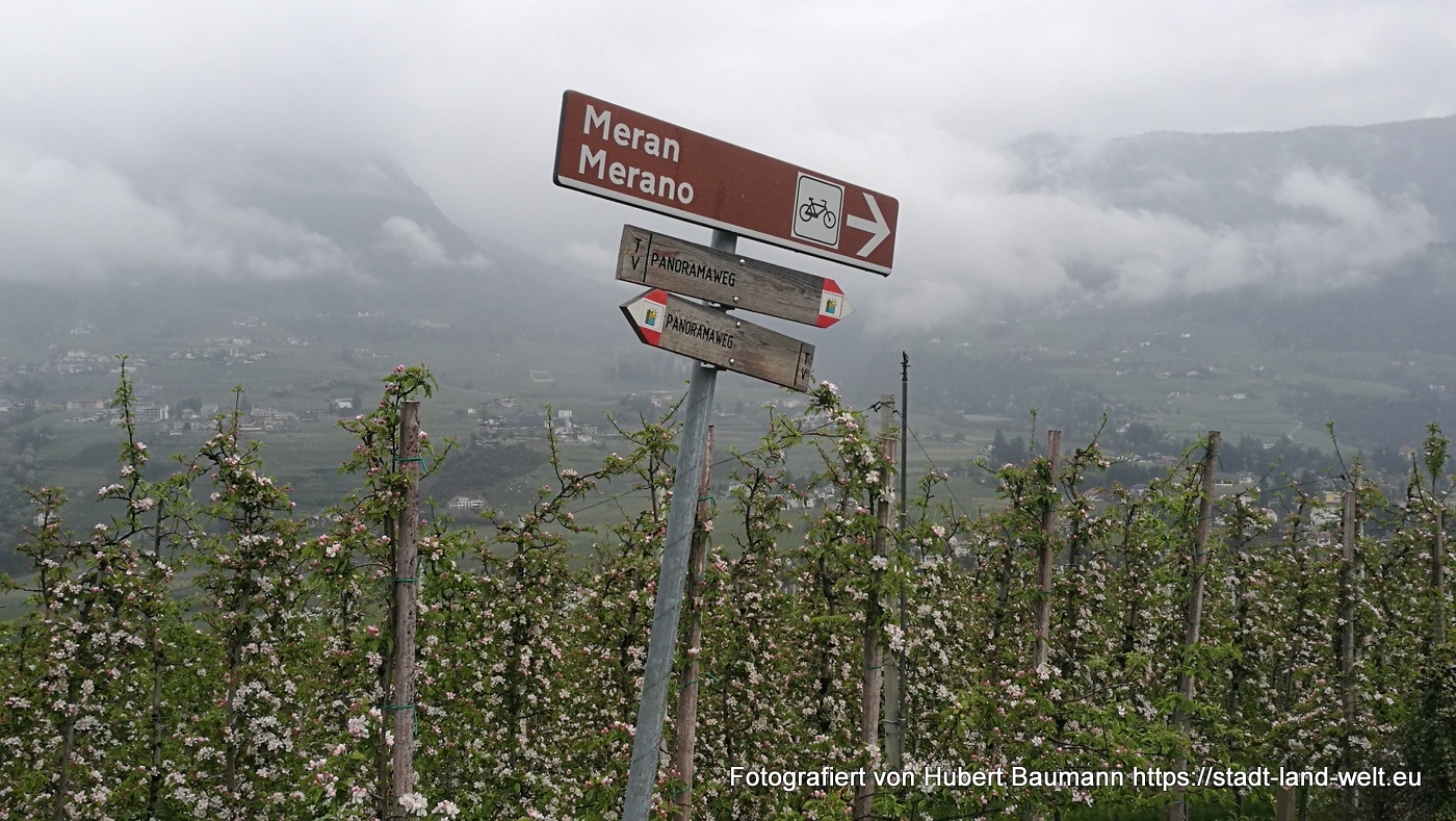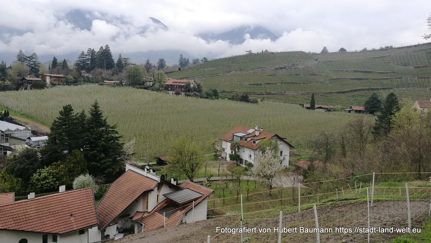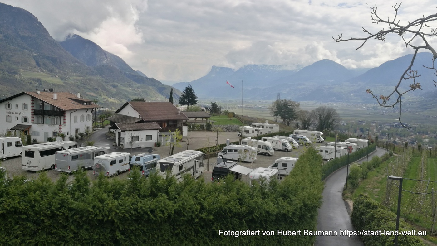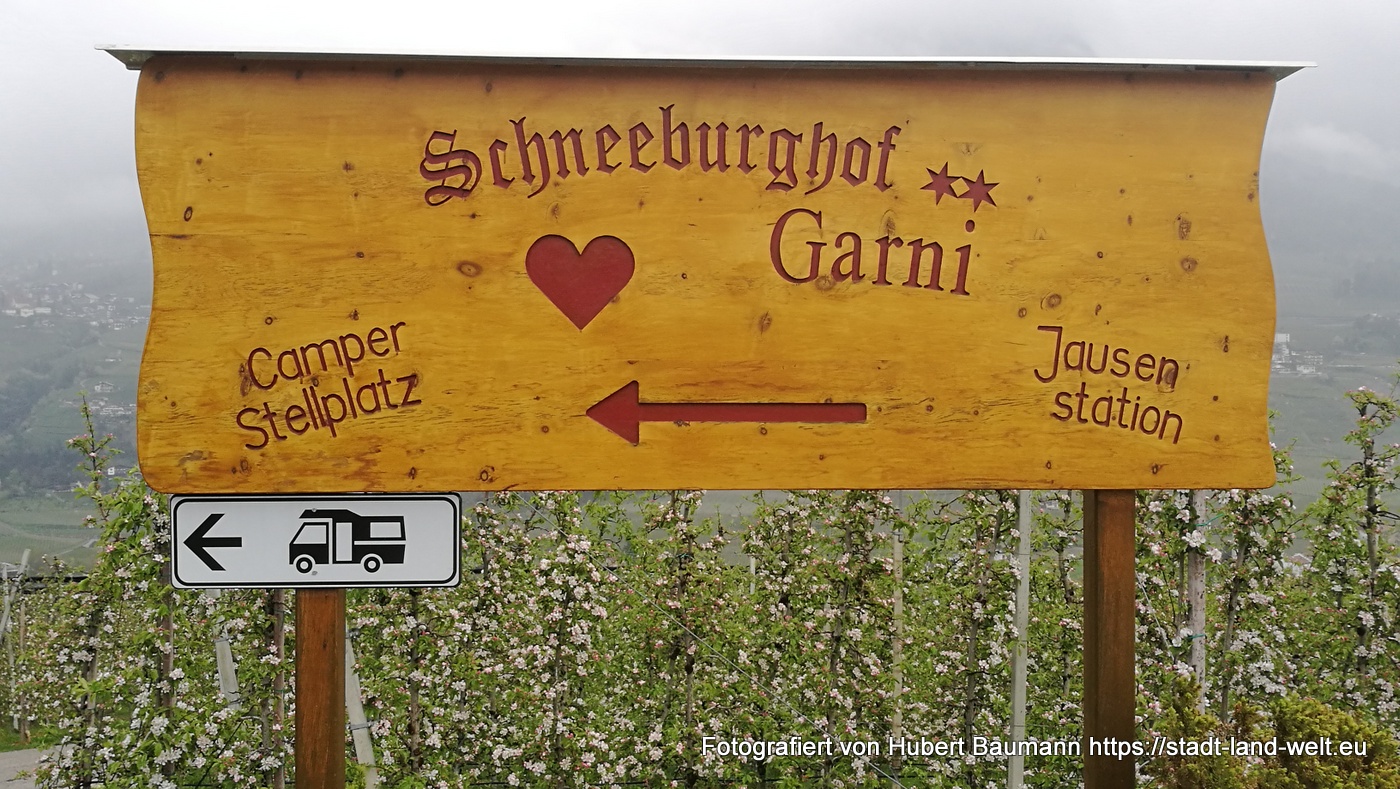 Dienstag: Wir erreichten den Caravan-Stellplatz Schneeburghof gegen 13:00 Uhr – nachdem wir uns ca. 1 Stunde mehrmals kreuz und quer durch irgendwelche Umleitungen durch Meran gekämpft hatten. Von einem Einheimischen erhielten wir dann den Tipp, eine Autobahnabfahrt weiter zu fahren und uns „von hinten anzuschleichen“, was uns dann auch gelang. Ein Rundgang am Nachmittag durch Dorf-Tirol und durch die Apfelplantagen und ein leckeres Abendessen auf dem Schneeburghof.