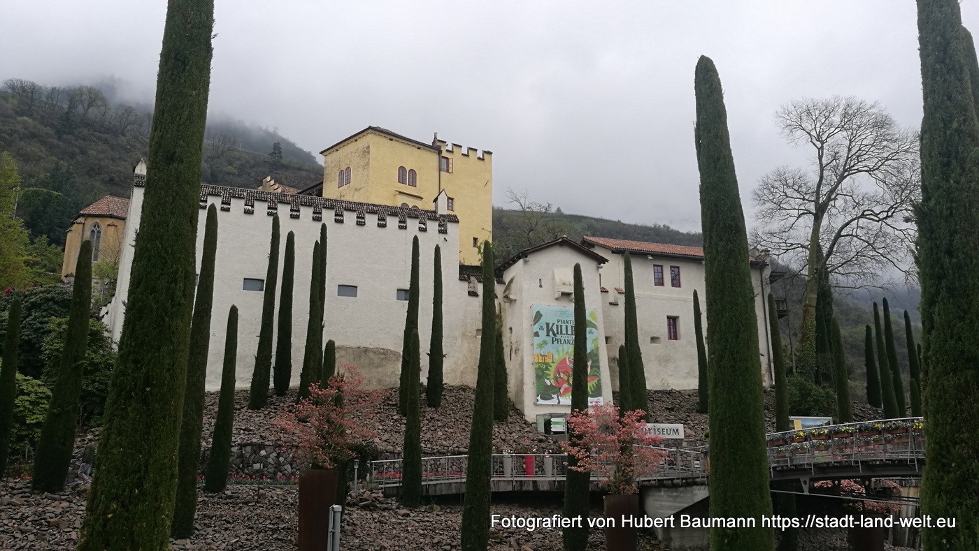 Mittwoch: Der Tag begann, wie der Vorabend endete: Mit Regen. Wir beschlossen uns davon nicht beeindrucken zu lassen und wie geplant die Gärten von Schloss Trautmannsdorf zu besuchen. Die Anreise mit dem öffentlichen Bus, der mit der Dorf-Tiroler Gästekarte in ganz Südtirol kostenlos genutzt werden kann, war schon ab Dorf Tirol etwas beschwerlich. Die Menschenmenge, die bereits bei Ankunft in Bus war und die, die noch reinwollte erinnerte mich irgendwie an meine Schulzeit und die überfüllten Schulbusse. Eine ältere Dame aus dem Ort stand entspannt neben mir und lächelte. Sie war diese Touristenmassen wahrscheinlich schon immer gewohnt. Sie gab uns noch einige Tipps, wie wir ab Meran zum Schloss weiterkommen, das wir nach mit einer Anreisezeit von ca. 45 Minuten dann auch erreichten.