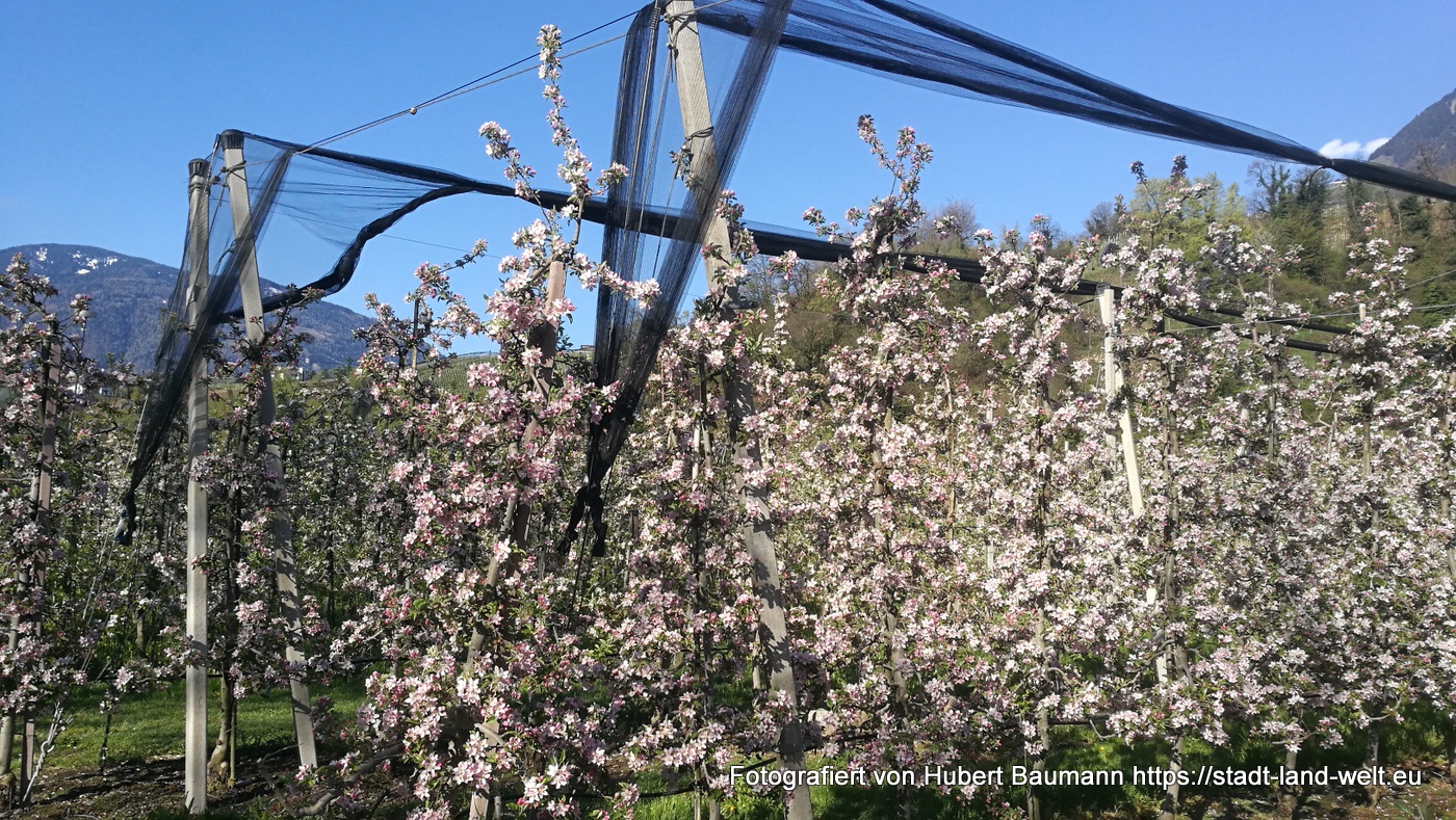 Wir brachen schon früh gegen 9:00 Uhr auf mit dem Fahrrad ins Passeier-Tal. Etwa 400 Höhenmeter hatten wir bis St. Leonhard zu überwinden. Der Weg führte uns zunächst ein Stück durch Meran und danach (wie sollte es anders sein) durch Apfelplantagen, Apfelplantagen und Apfelplantagen. Auf dem Weg ins Passeiertal konnten wir auch unseren Stellplatz in Dorf-Tirol, den wir wenige Tage vorher besucht hatten, oben auf dem Hügel erkennen.