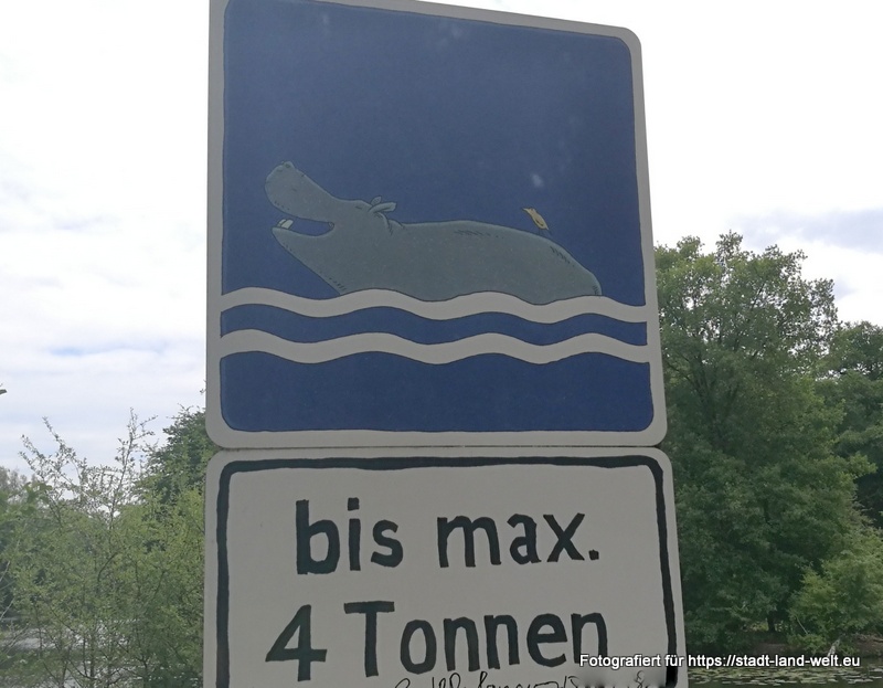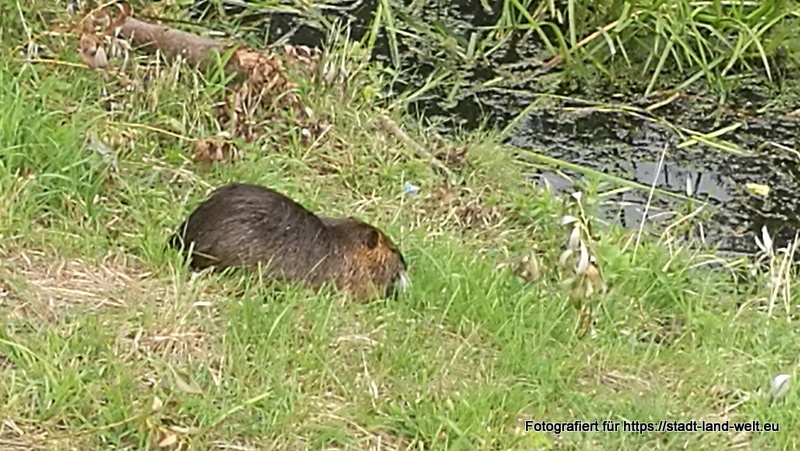 Und was man dort so alles entdeckt: Nilpferde, Wasserski fahrende Pinguine und sogar einen Bisam, der ungestört am Wegesrand gerade seine Mahlzeit einnahm. Fälschlicherweise oft als Bisamratten bezeichnet sehen diese Tierchen mit ihrer stumpfen Nase doch ganz putzig aus. Nein, es war keine „Ratte“, es war ein „Bisam“. ….. der etwa 5 Meter vom Fahrradweg an der Böschung in aller Seelenruhe sein Mittagessen verspeiste.