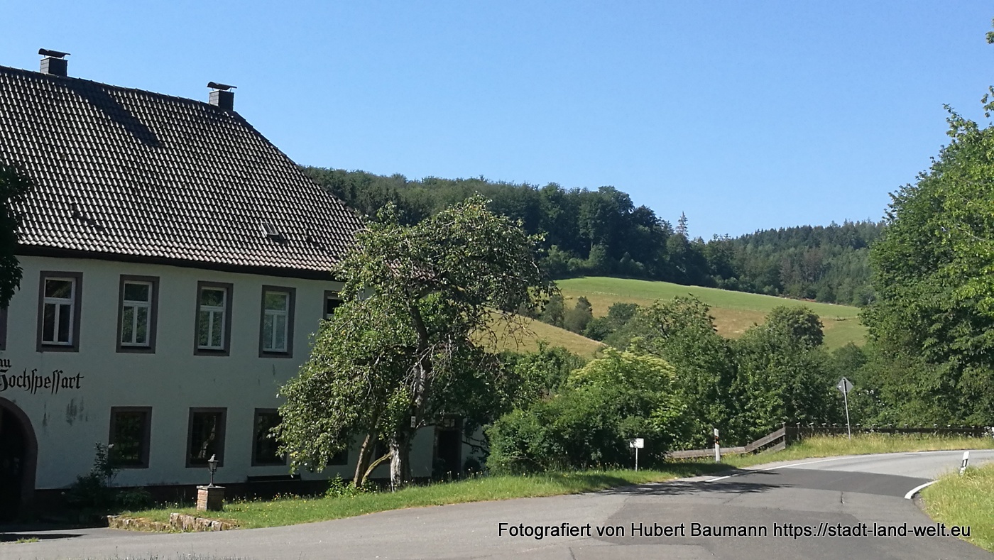 Ab der Straßenkreuzung nach Rothenbuch geht es in der Tat nur noch bergab. Allerdings – abgesehen von dem ersten Stück – nicht so steil, dass man nicht hin und wieder doch in die Pedale treten muss, um nicht zu viel an Speed zu verlieren. Und so konnte ich bereits kurz vor 11:00 Uhr meine Spessart-Überquerung per Whats-App nach Hause verkünden: Standort Hafenlohr im Landkreis Main-Spessart.