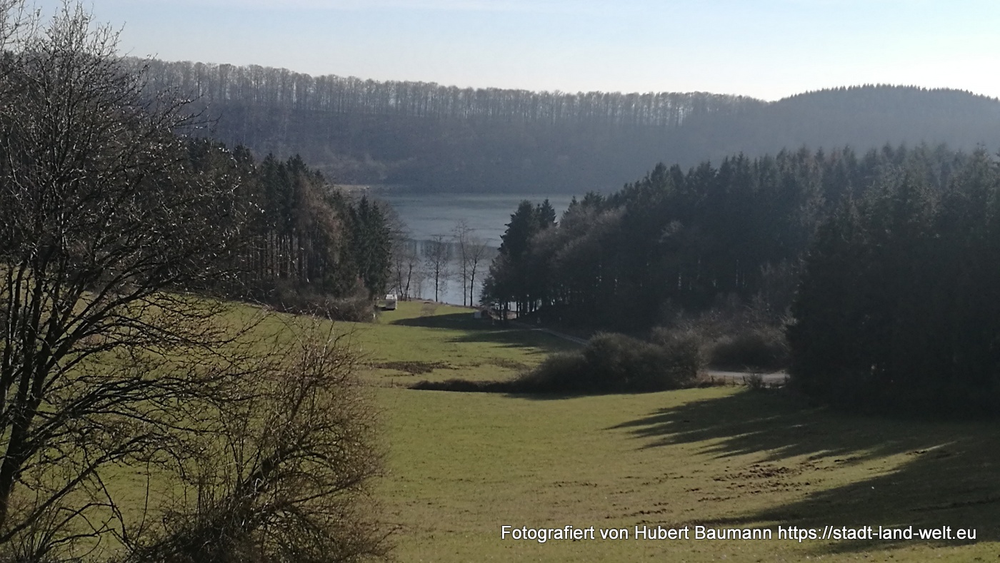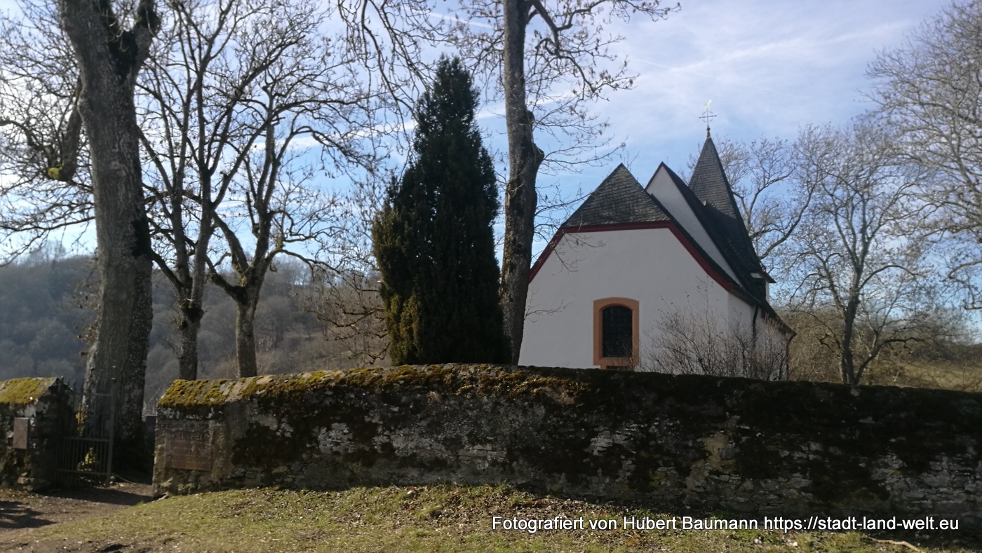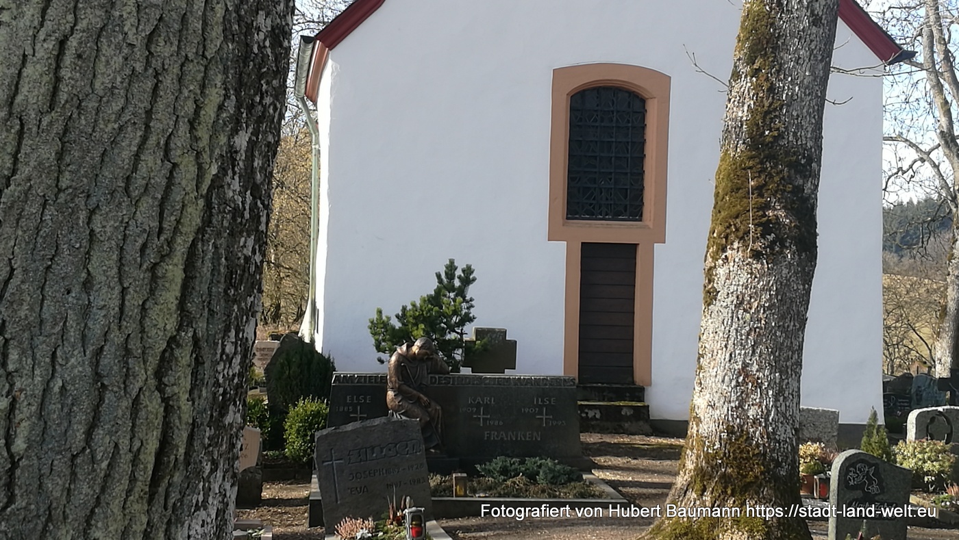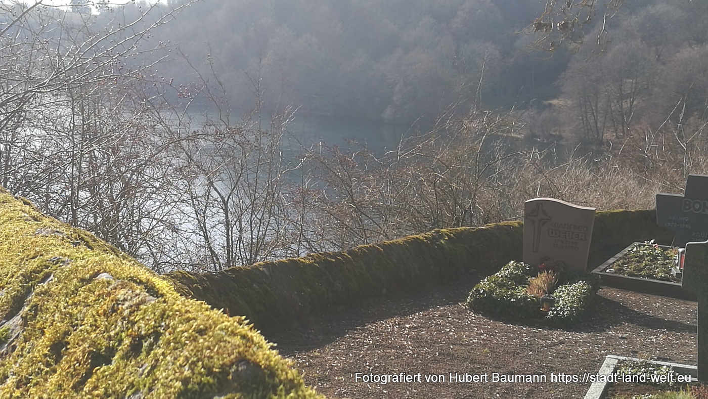 Am kommenden Tag stand der Maare-Moselradweg von Gillenfeld nach Daun auf dem Programm. Mit jeweils kleinen Abstechern erreicht man die drei Dauner Maare, das Schalkenmehrener Maar, das Weinfelder Maar (auch Totenmaar) und das Gemündner Maar. Besonders idyllisch und ruhig gelegen (wenn nicht gerade eine 6 – 8 köpfige Wandergruppe einläuft) ist der kleine Friedhof der Gemeinde Schalkenmehren auf der Kraterwand des Weinfelder Maars.