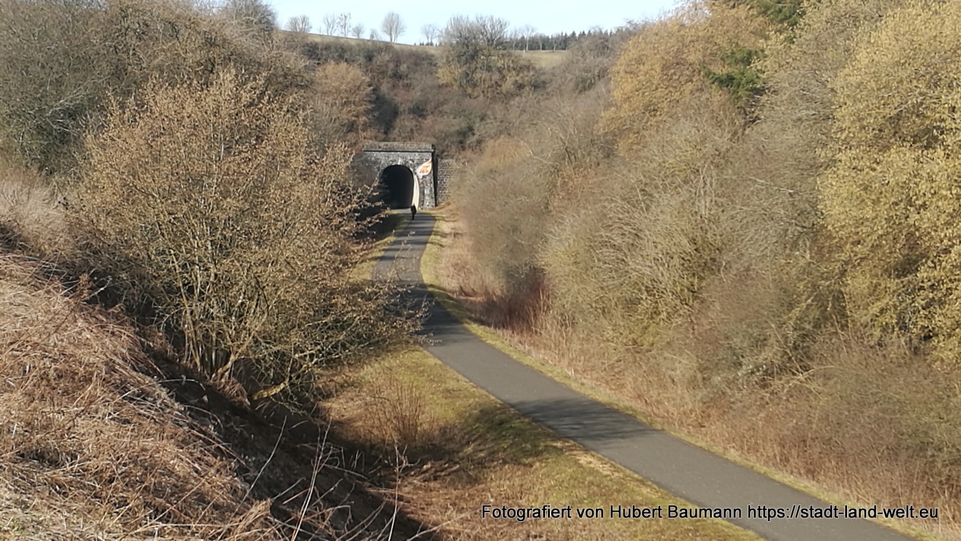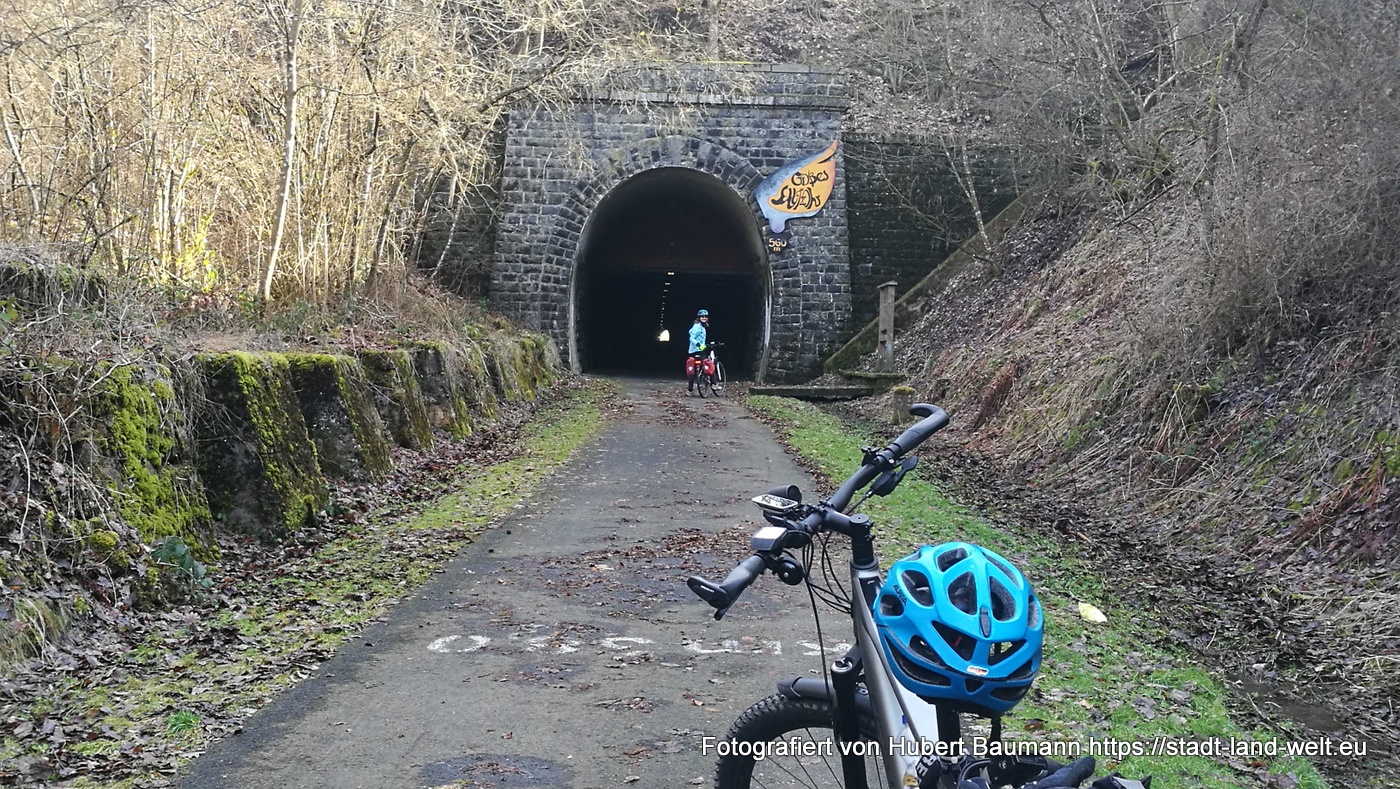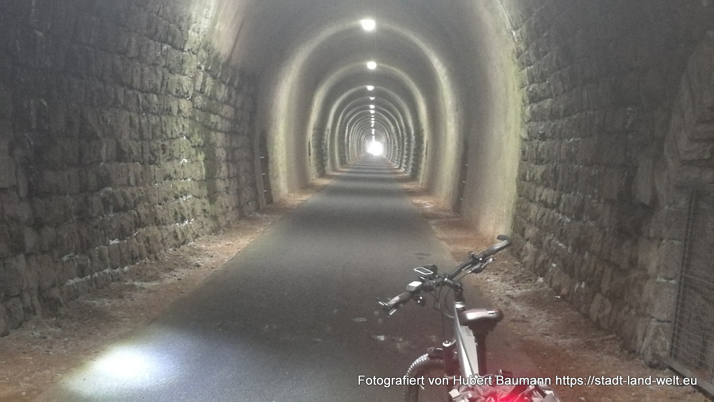 Eine besondere Attraktion für mich war der 560 m lange Bahntunnel, durch den man nun logischerweise auch als Radfahrer durch muss, wenn man den Bahntrassenradweg nicht verlassen will. Ganz schön kalt, je weiter man sich in Richtung Mitte des Tunnels bewegt. Wir haben den Hinweg über den Berg gewählt, vorbei am Weinfelder Maar und Gemündner Maar, und den Rückweg durch den Tunnel.
