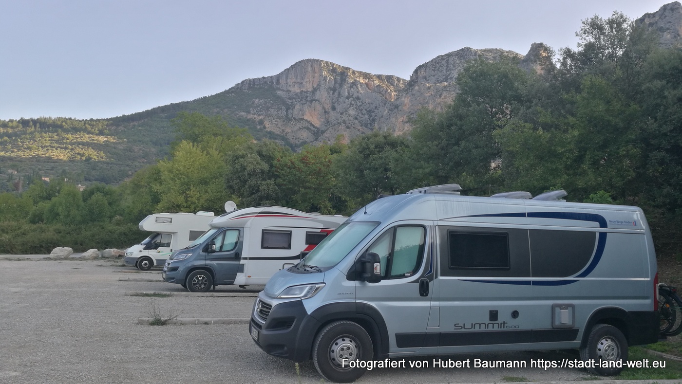 Übernachtet haben wir auf dem großen AirePark Castellane am Fuße des Felsens mit der Kapelle Notre Dame du Roc. Direkt hinter uns (Blick aus dem Schlafzimmerfenster) der Verdon-Fluss, der uns die ganze Nacht mit seinem Rauschen begleitet und den wir in den kommenden Tagen näher kennenlernen wollen. Zur Innenstadt von Castellane sind es ca 100 m über die Straße. Dort gibt es auch Bäcker und andere Annehmlichkeiten für das tägliche Leben.
