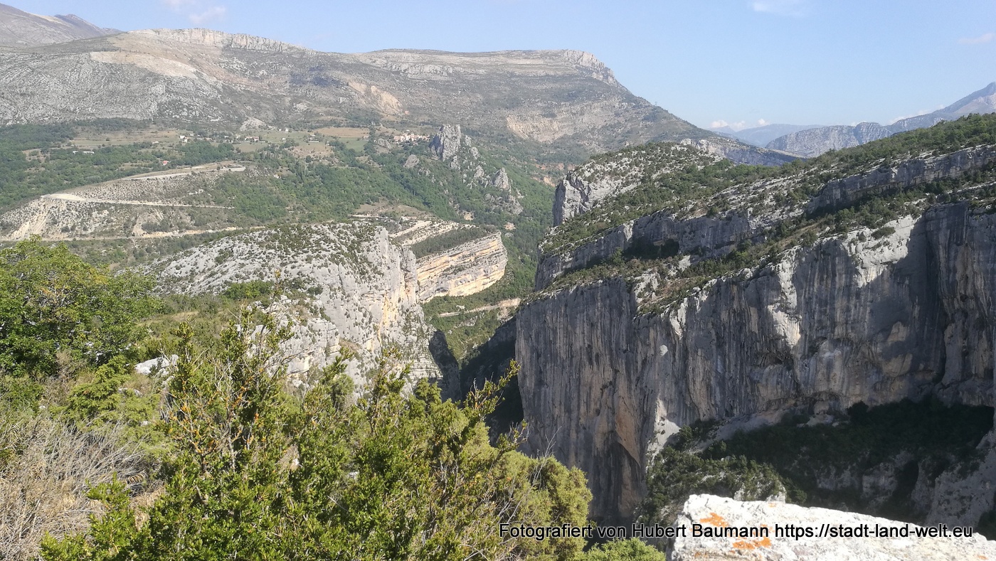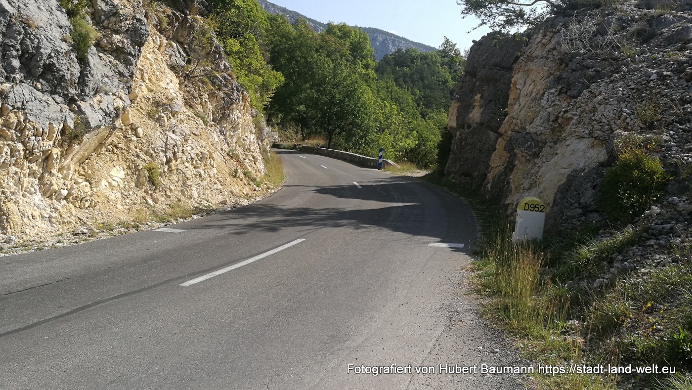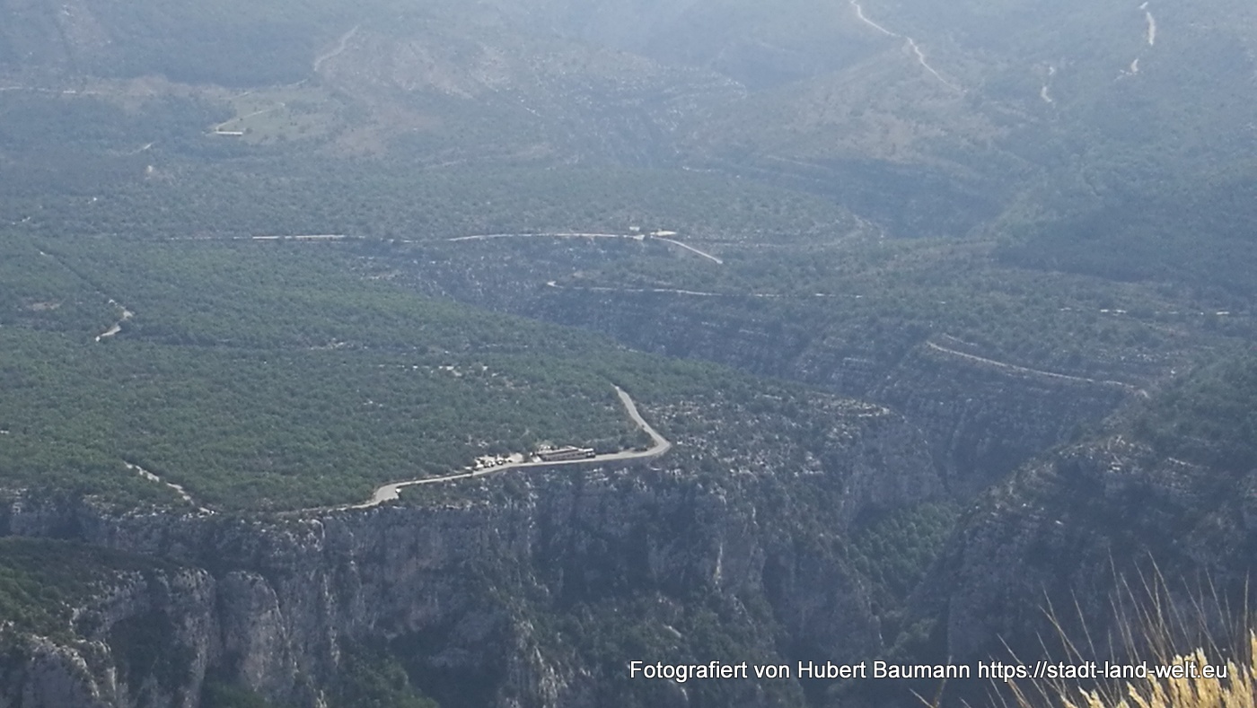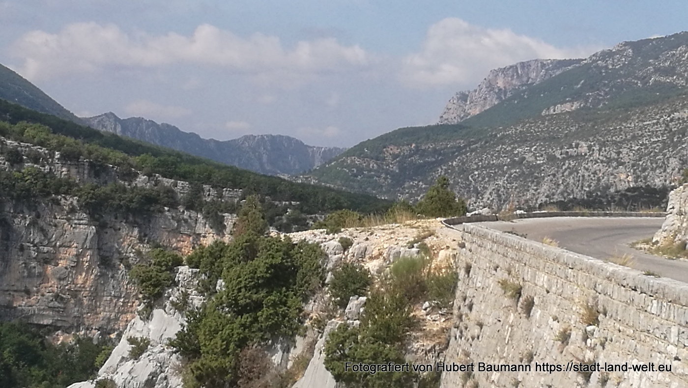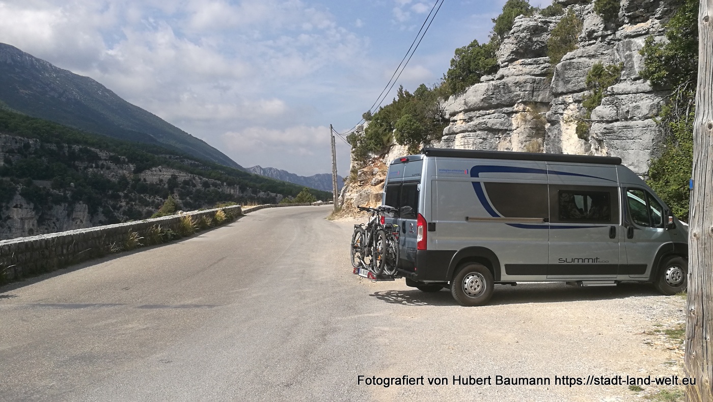 Nach unseren ersten Bagettfrühstück (seit wir in Frankreich sind) mit Käse und anderen Produkten aus der Region starten wir gegen 10:00 Uhr in Richtung Schlucht von Verdon. Unser Tagesziel ist Moustiers-Staintes-Marie am anderen Ende der Schlucht. Wir nehmen die Nordroute über die D952, die laut Reiseführer etwas einfachere Tour. Ergänzen diese aber mit einer Schleife über die Route de Crete (D21), einer abenteuerliche Höhenstraße mit vielen Aussichtspunkten, die kurz vor La Palud sur Verdon von der Hauptroute nach links abzweigt und nach einer Rundtour von ca. 23 km wieder auf die Hauptstrecke zurückführt.
