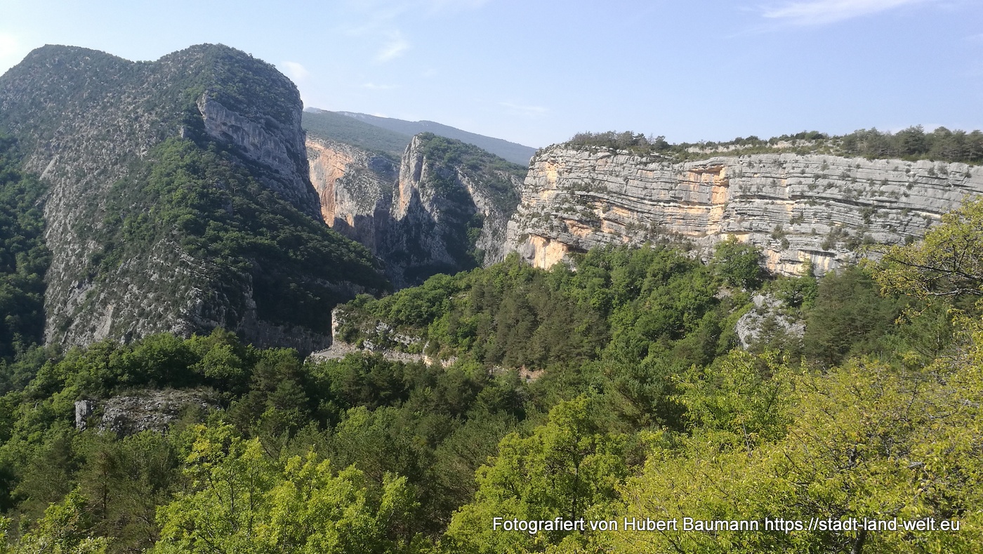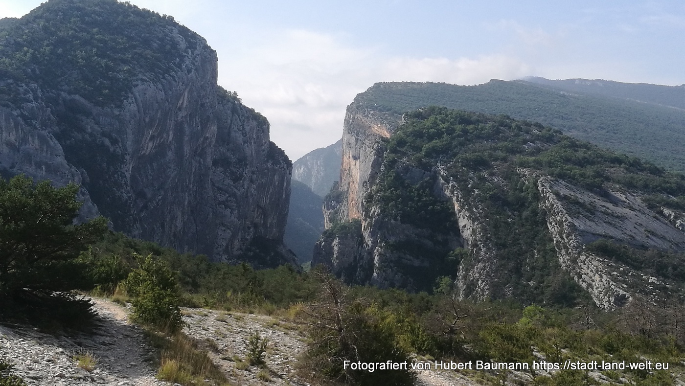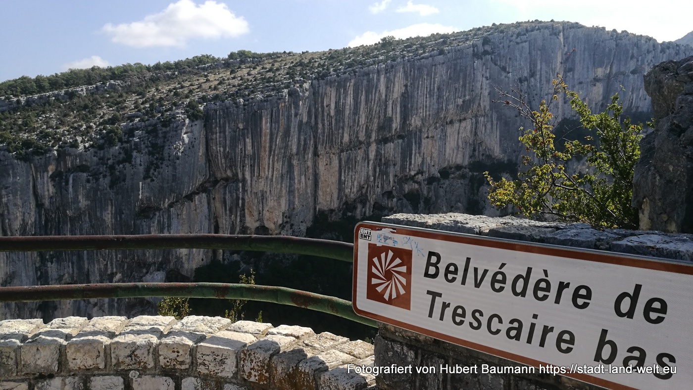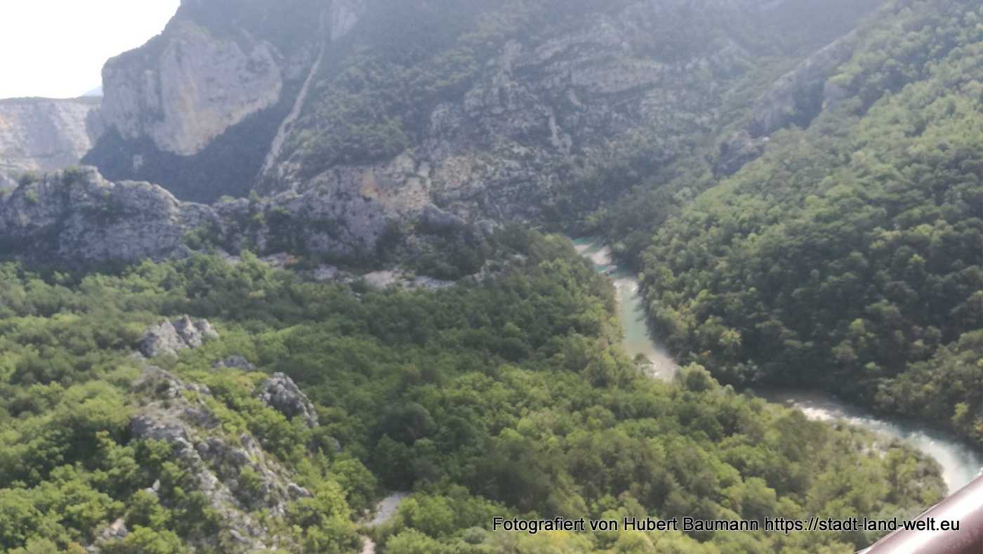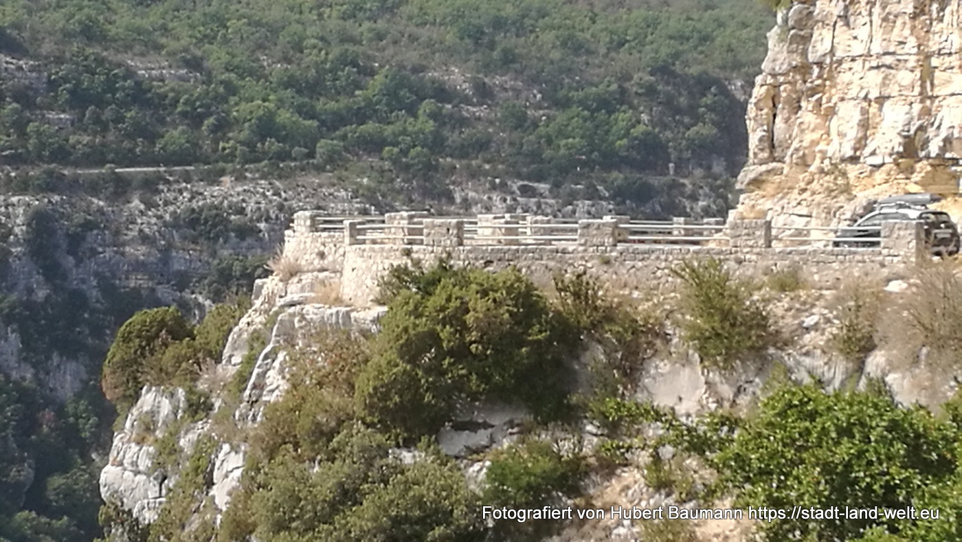 Nach unseren ersten Bagettfrühstück (seit wir in Frankreich sind) mit Käse und anderen Produkten aus der Region starten wir gegen 10:00 Uhr in Richtung Schlucht von Verdon. Unser Tagesziel ist Moustiers-Staintes-Marie am anderen Ende der Schlucht. Wir nehmen die Nordroute über die D952, die laut Reiseführer etwas einfachere Tour. Ergänzen diese aber mit einer Schleife über die Route de Crete (D21), einer abenteuerliche Höhenstraße mit vielen Aussichtspunkten, die kurz vor La Palud sur Verdon von der Hauptroute nach links abzweigt und nach einer Rundtour von ca. 23 km wieder auf die Hauptstrecke zurückführt.