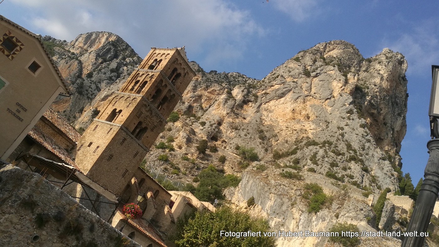 Moustiers- Staintes-Marie erreichen wir gegen 15:00 Uhr. Der Stellplatz dort ist bei Weitem nicht so eindrucksvoll wie wir uns ihn aus den Beschreibungen vorgestellt hatten. Dennoch lädt der Platz wie auch der Ort, der komplett an die Felsen gebaut ist und kaum ebene Straßenzüge aufweist, zu einem Besuch ein. Deutlich touristisch geprägt, wesentlich kleiner und dörflicher als am Tag zuvor Castellane, welches doch etwas städtischer wirkt.