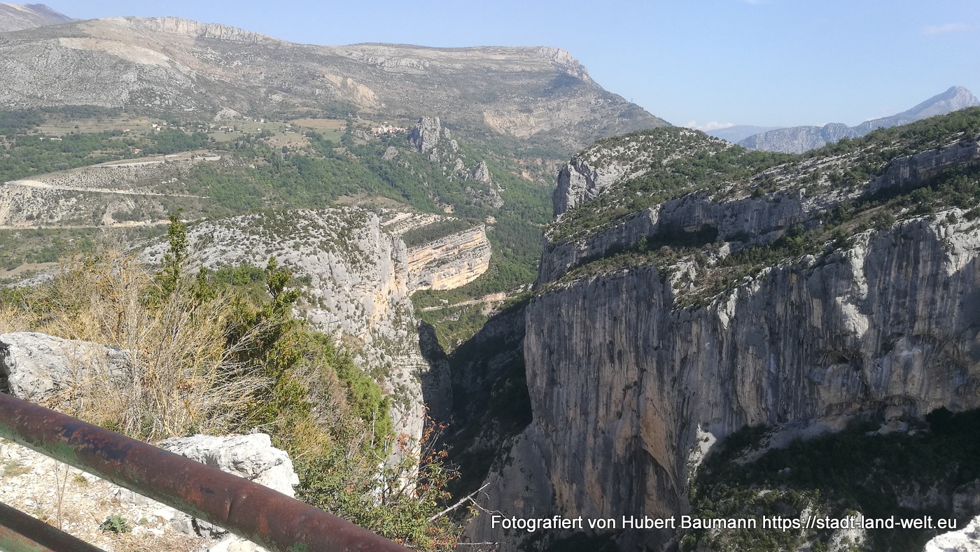 Nach unseren ersten Bagettfrühstück (seit wir in Frankreich sind) mit Käse und anderen Produkten aus der Region starten wir gegen 10:00 Uhr in Richtung Schlucht von Verdon. Unser Tagesziel ist Moustiers-Staintes-Marie am anderen Ende der Schlucht. Wir nehmen die Nordroute über die D952, die laut Reiseführer etwas einfachere Tour. Ergänzen diese aber mit einer Schleife über die Route de Crete (D21), einer abenteuerliche Höhenstraße mit vielen Aussichtspunkten, die kurz vor La Palud sur Verdon von der Hauptroute nach links abzweigt und nach einer Rundtour von ca. 23 km wieder auf die Hauptstrecke zurückführt.