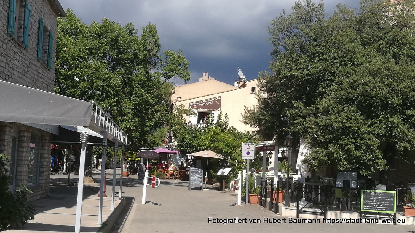 Unterhalb des Campingplatzes in ca. 100 m Entfernung vom Haupteingang der Lac du Saint Croix, hinter uns dem Weg des terrassenartig angelegten Platzes folgend zum Hinterausgang und man steht direkt am Marktplatz des kleines Dorfes. Dort kann man sich auch mit Lebensmitteln und natürlich am Morgen mit Bagette versorgen.