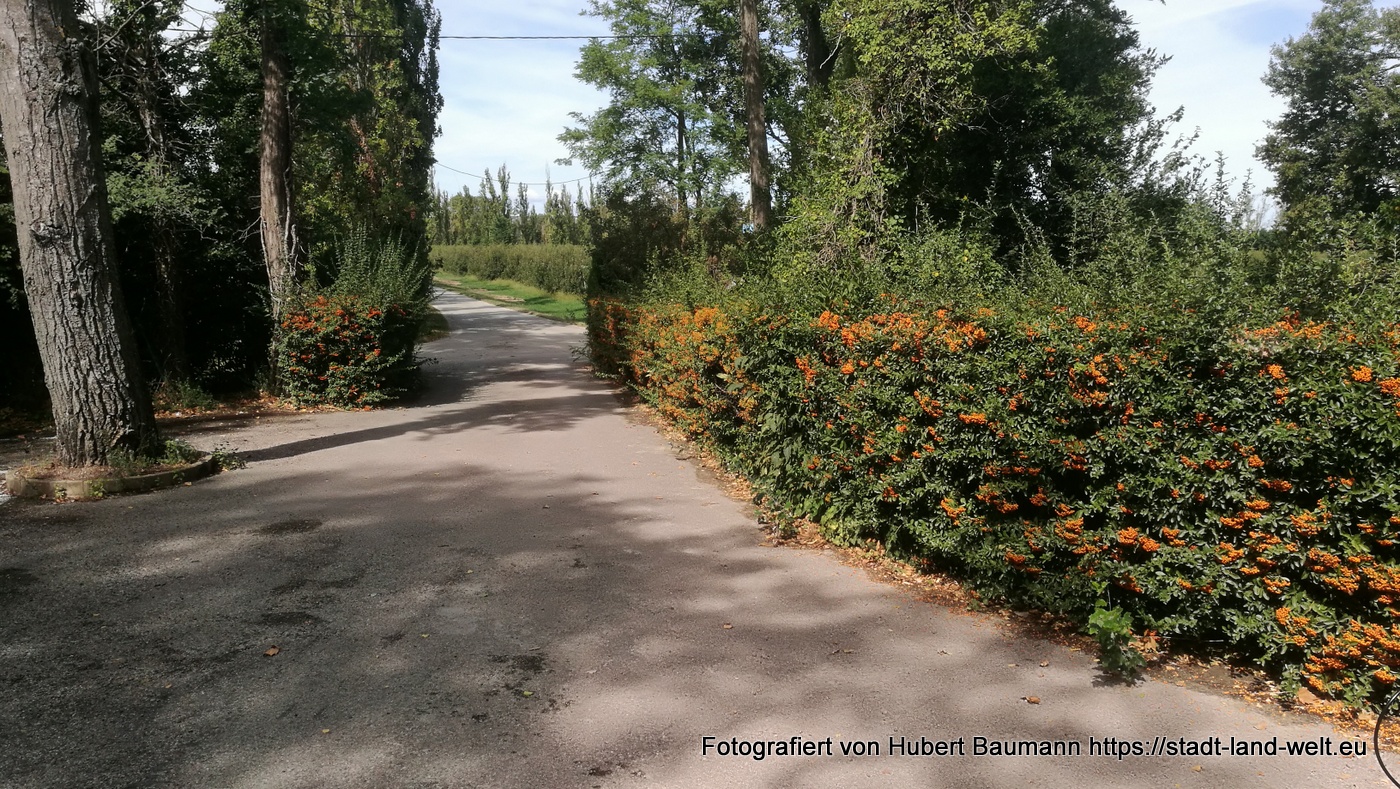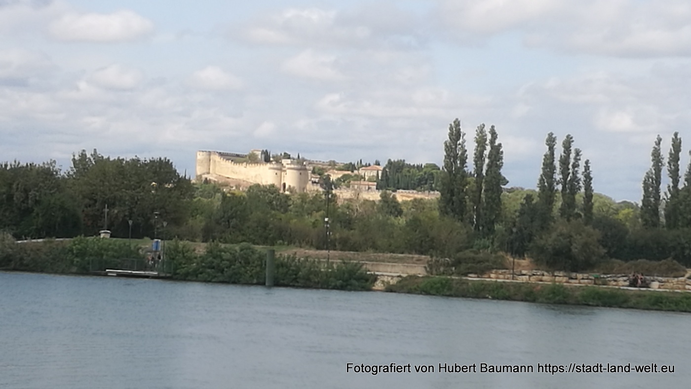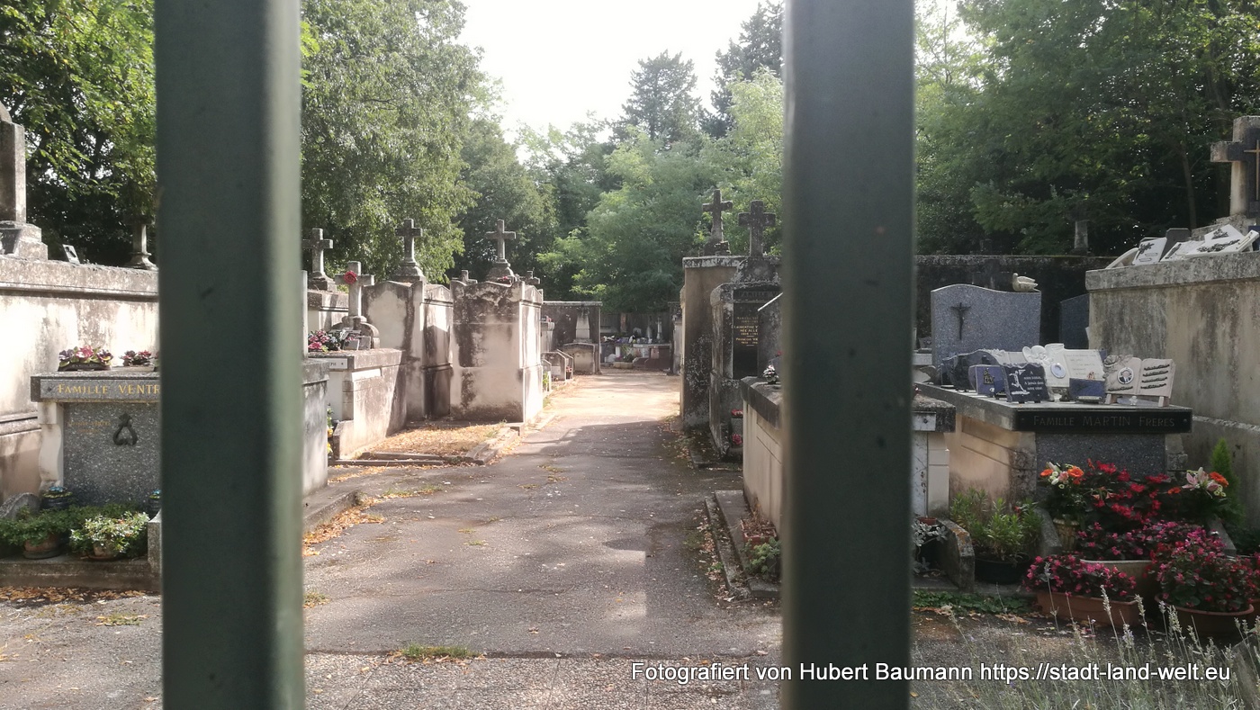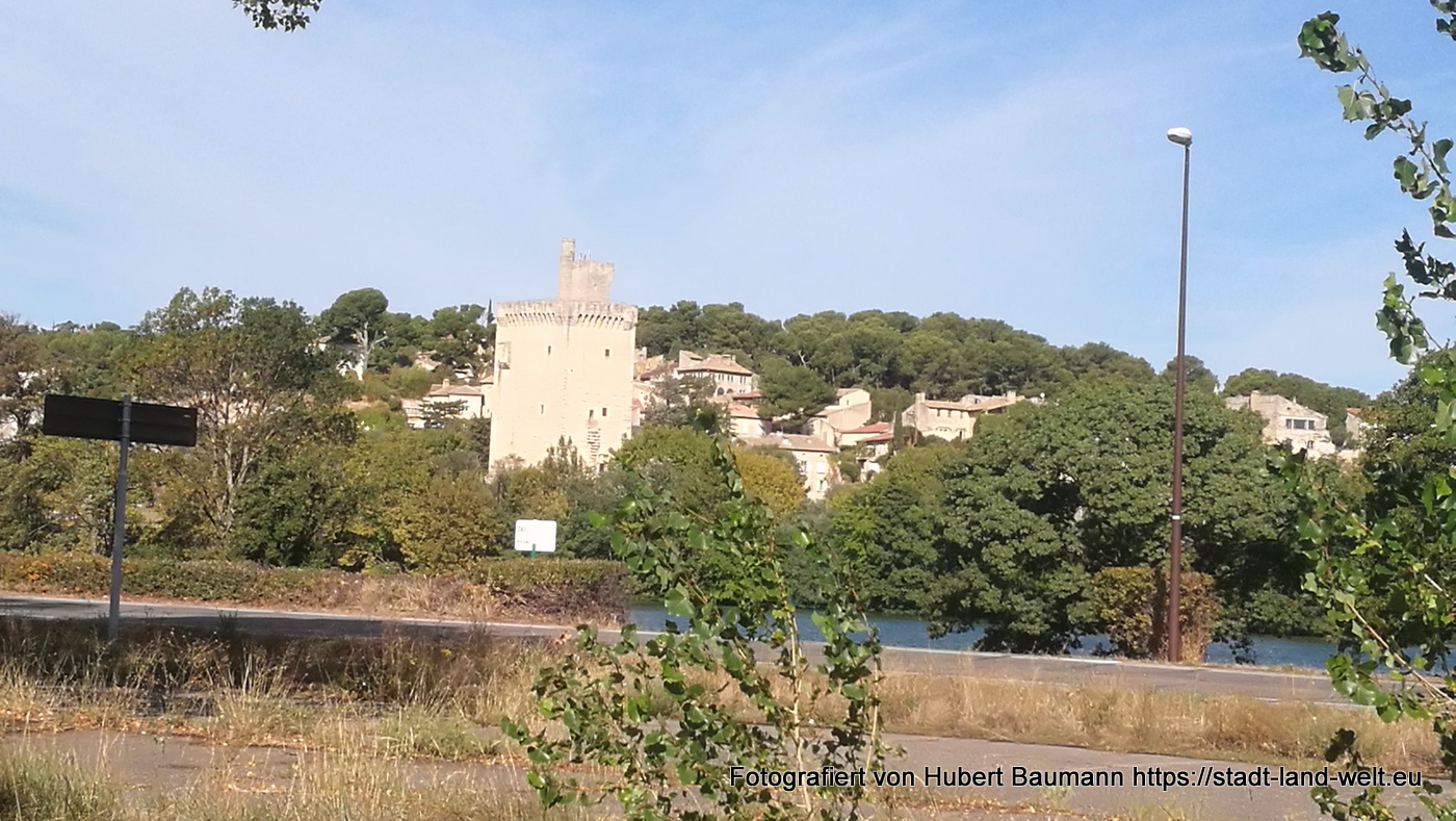 Wer Zeit hat, sollte sich den Abstecher auf die Insel Barthelasse nicht entgehen lassen. Mich erinnert unsere Rundfahrt an eine Mischung aus Wiener Donauinsel, Lobau und rießigen Obstplantagen, wie wir sie in Südtirol im Frühjahr kennengelernt hatten. Dazwischen immer wieder vereinzelt Höfe (Domains) mit rießigen Zufahrten und Zedernbäumen rechts und links. Äußerst interessant auch der kleine Friedhof am Chateau Barthelasse.