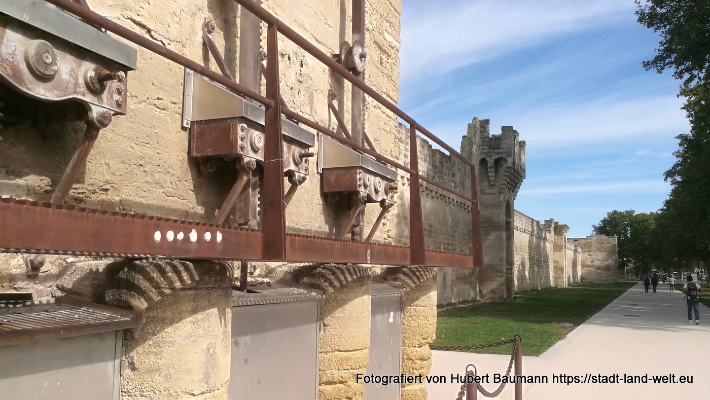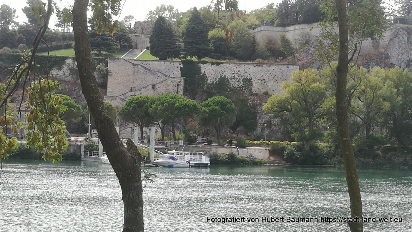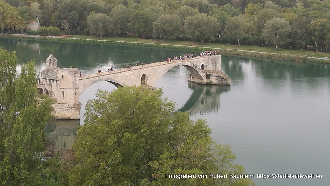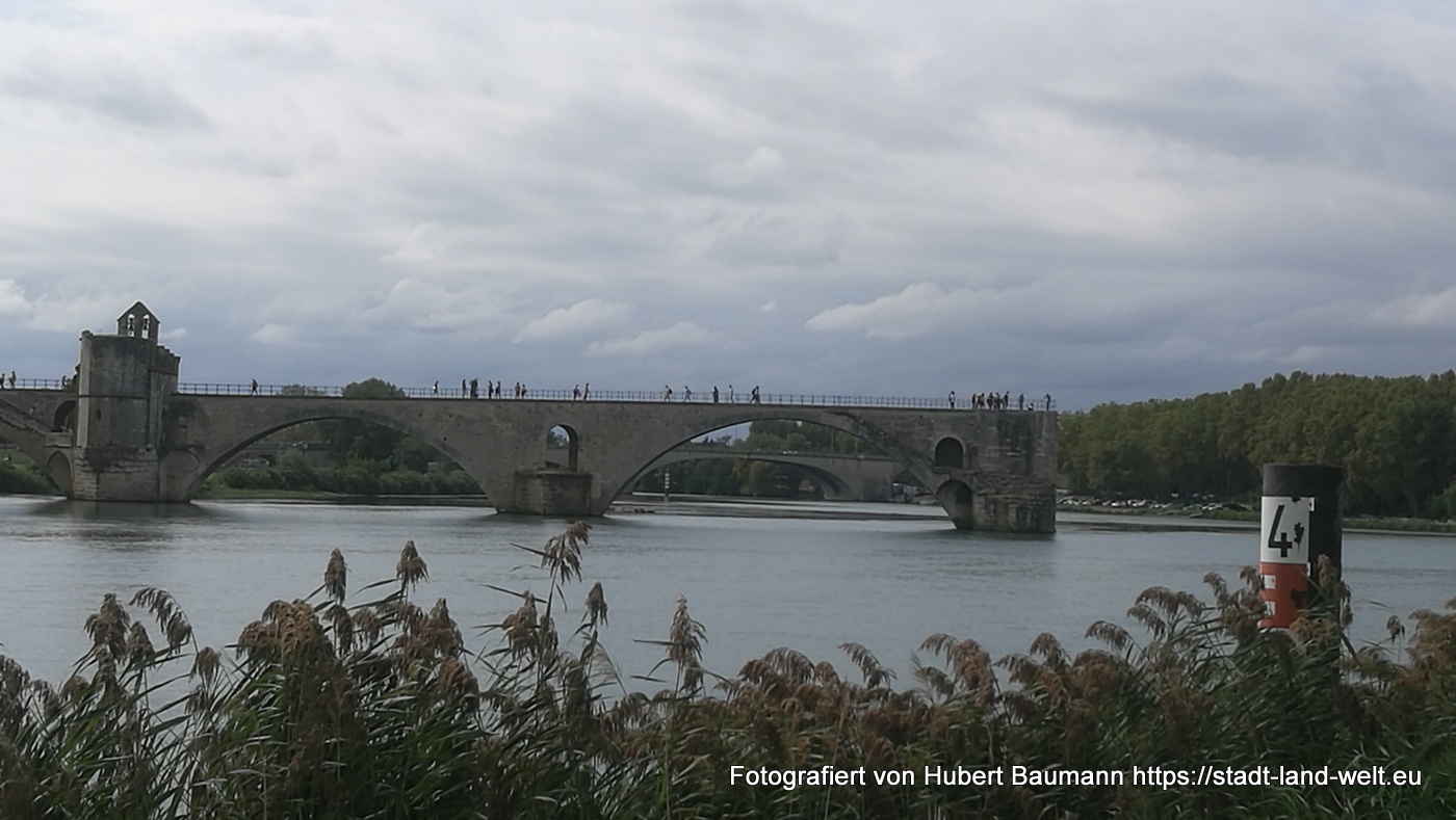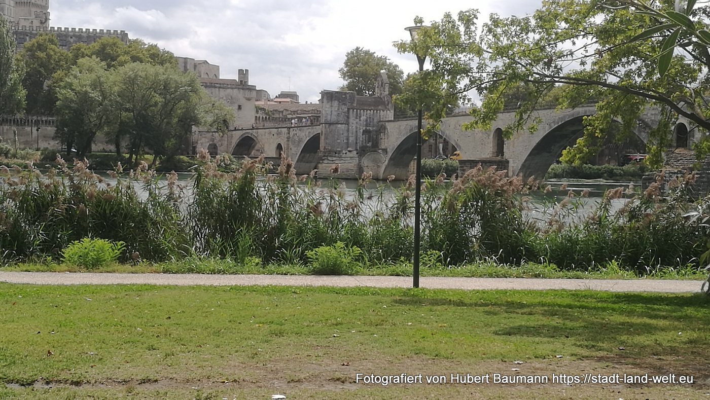 In die Innenstadt gelangt man mit einer kleinen Personenfähre, die zwischen Insel und Festland im 1/2-Stunden-Takt pendelt und die von unserem Platz aus in wenigen Gehminuten erreichbar ist. Ausgiebiger Rundgang durch die Stadt, unterbrochen von einigen Regenschauern, die sich jedoch schnell wieder verziehen und die Luft schwülwarm werden lassen. Mit auf dem Programm steht natürlich auch die Brücke von Avignon, von deren ursprünglich 22 Bögen, die auf die gegenüberliegende Seite der Insel führten, nur noch 4 erhalten sind.