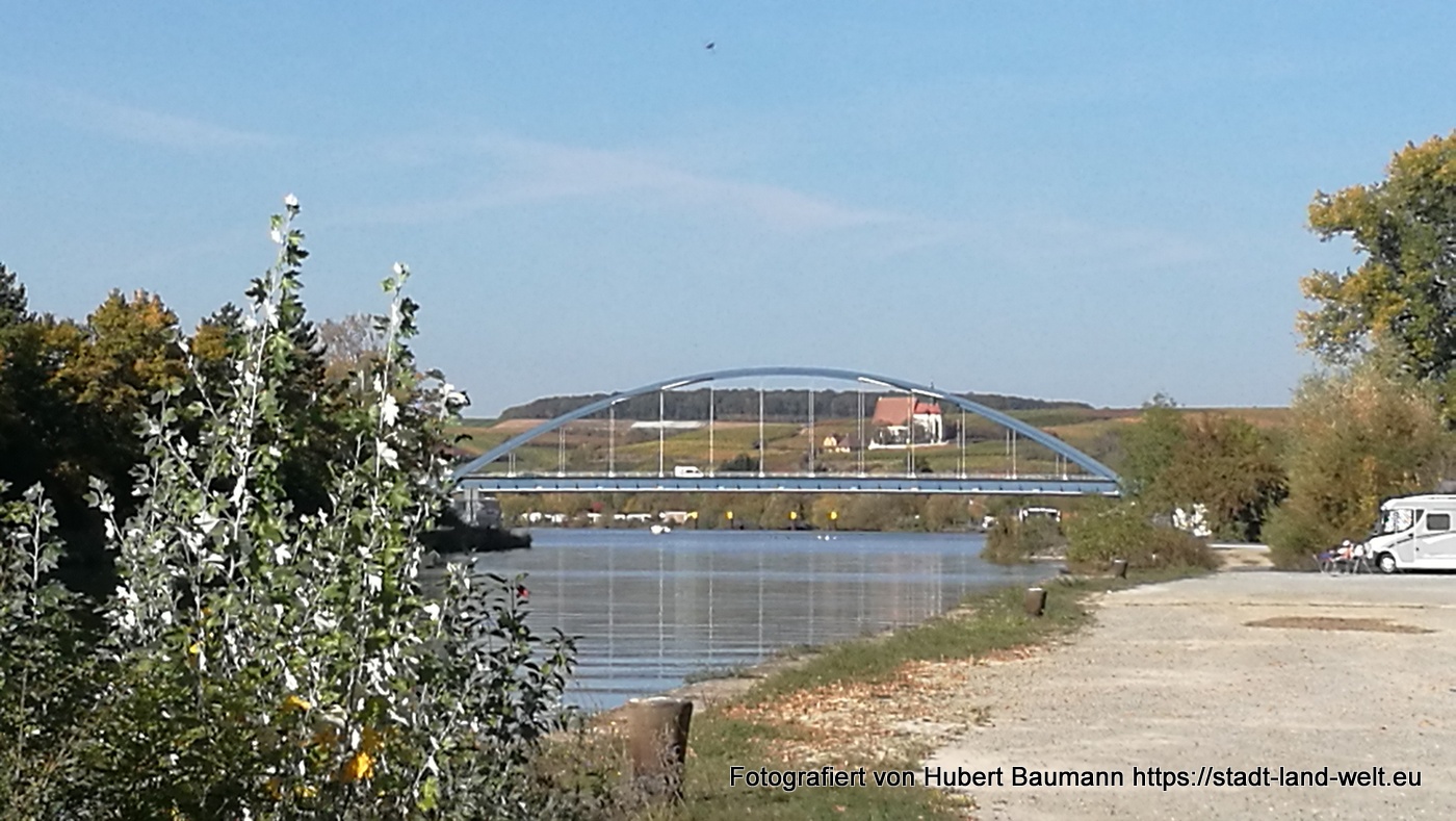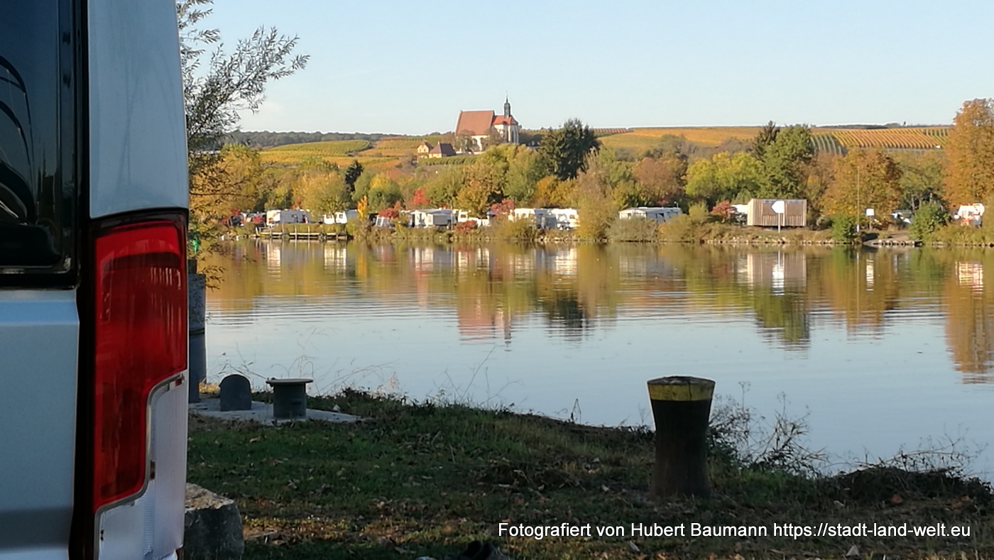Unser Quartier hatten wir auf dem offiziell von der Stadt ausgewiesenen Stellplatz auf der Astheimer Mainseite bezogen (nachdem uns der Platz auf der Volkacher Seite schon sehr gut gefüllt erschien. Der Platz ist ohne jegliche Infrastruktur und liegt in der direkten „Einflugschneise“ zu einem Beton- und Schotterwerk, das auch am Samstag Vormittag gut besucht war. Für eine Übernachtung (zwischen 17:30 Uhr und 8:00 Uhr früh) ein schöner Platz mit einer schönen Aussicht nach Volkach und die dahinterliegenden Weinberge und der Wallfahrtskirche „Maria im Weingarten“. Wer länger bleiben möchte, dem empfiehlt sich der Platz auf der Volkacher Seite oder ein Standplatz in einem der zahlreichen Weingüter, die als Gastgeber ja auch immer gerne anbieten.