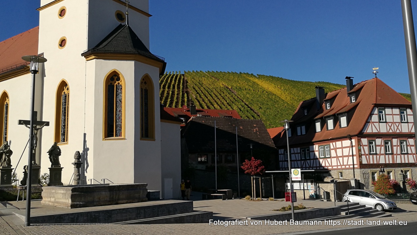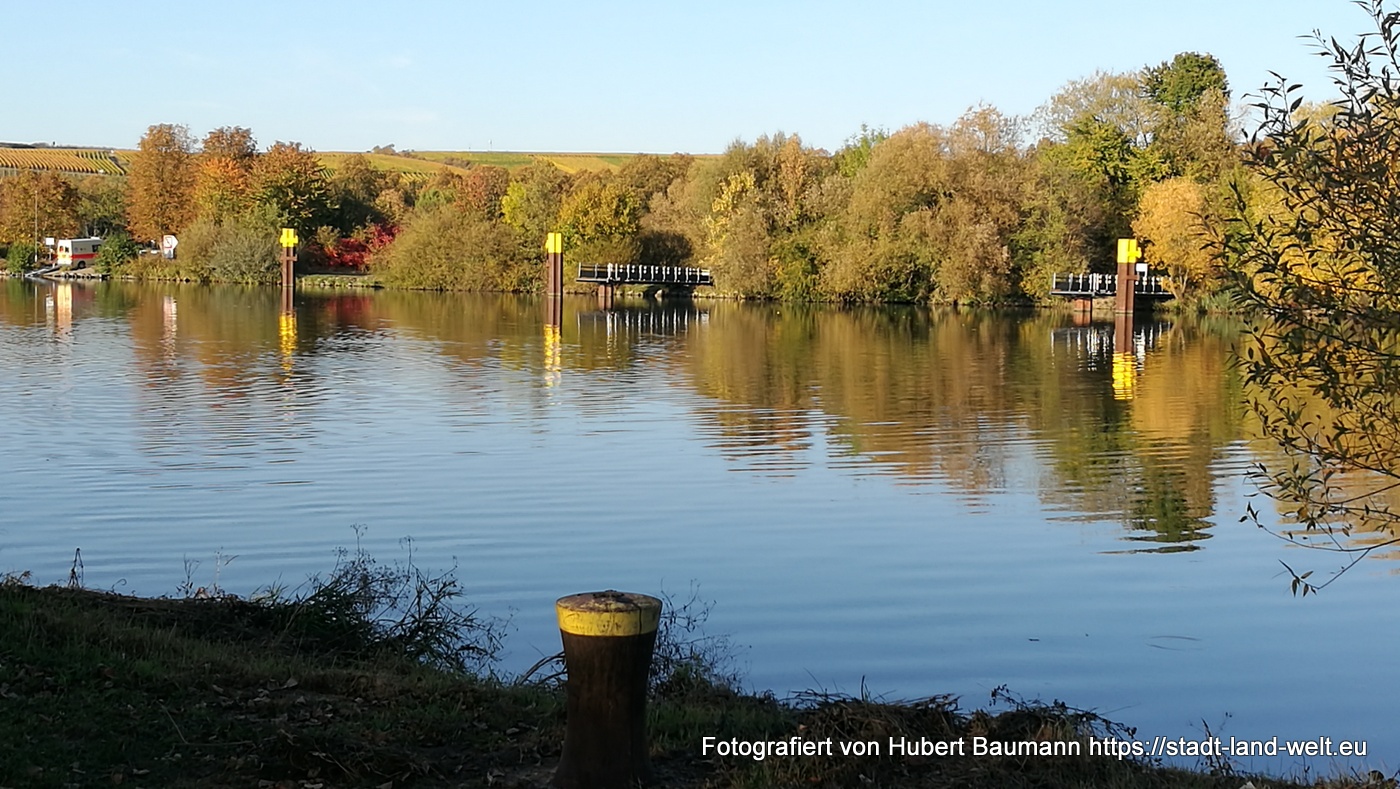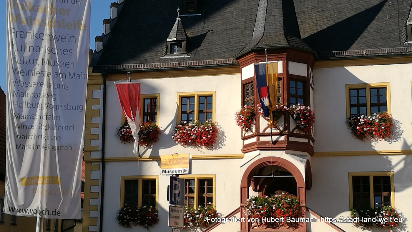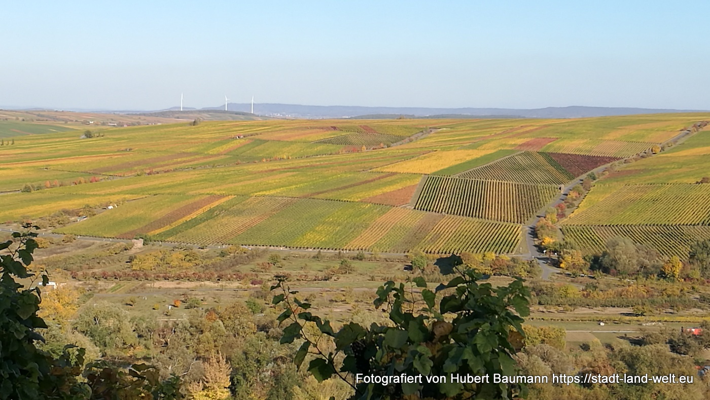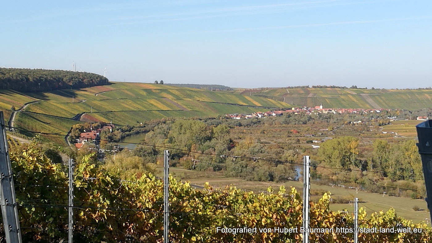 Unser Zwei-Tages-Ausflug führte uns an diesem Herbstwochenende zur Mainschleife nach Volkach. Der Wein ist inzwischen weitgehend gelesen und das Laub an den Weinstocken beginnt, sich in den unterschiedlichsten Farben (je nach Rebsorte) zu färben und zeichnet in den Weinbergen rechteckige Farbmuster, an denen man sich kaum sattsehen kann.