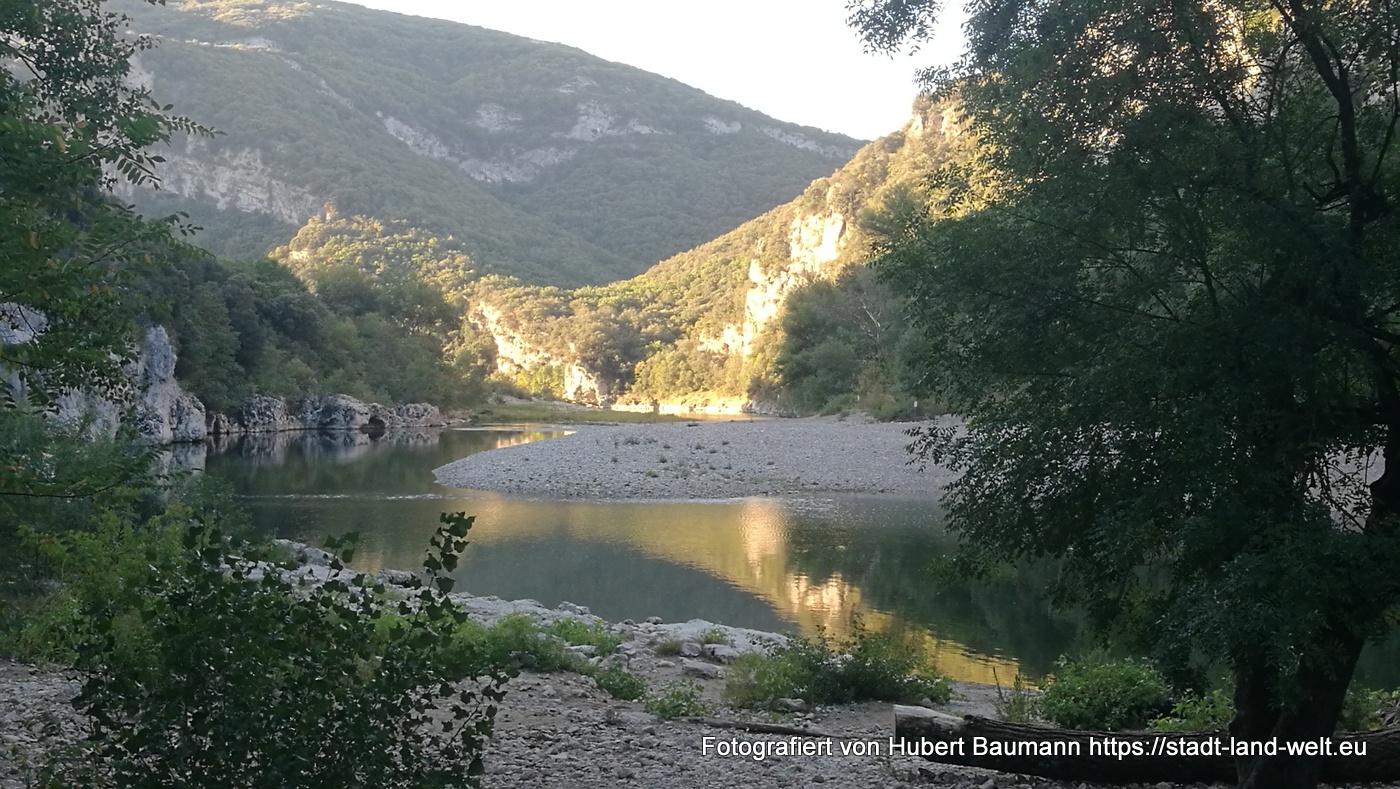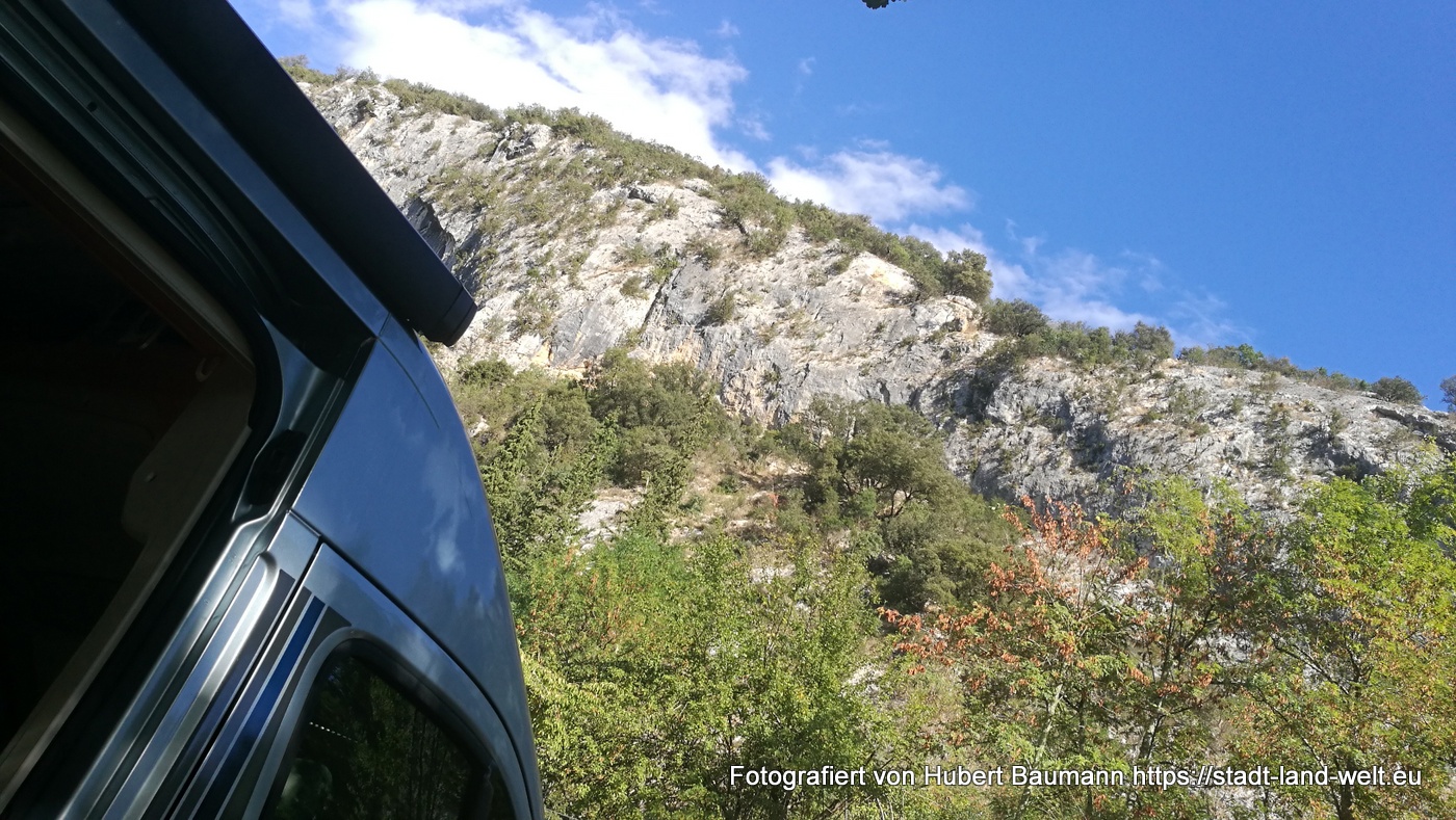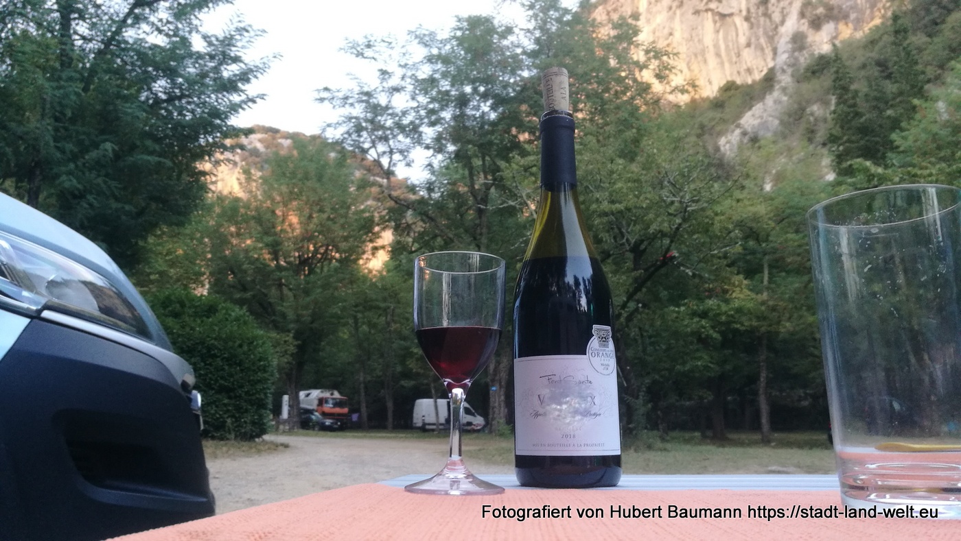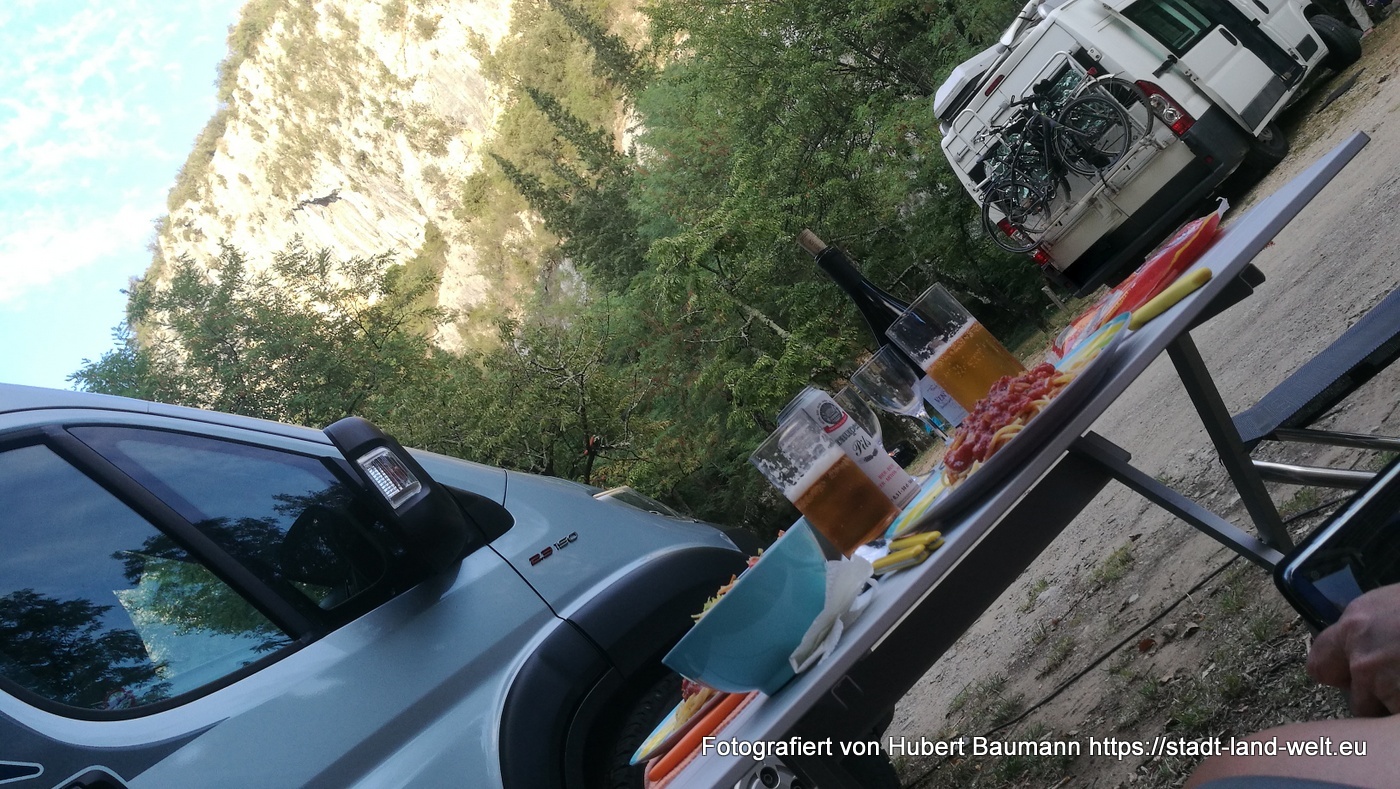 Unser Nachtlager finden wir schnell an dem kleinen Campingplatz am Ende Schlucht „Camping Pont d’Arc“. Man biegt, sobald man den Pont d Arc von der Straße aus linkerhand sieht, nach etwa 300 m links ab. Ein uriger kleiner Platz mitten im Wald und umrahmt von steilen Bergriesen. Freundliche Rezeption, keine feste Parzellierung und direkter Zugang und Bademöglichkeit am Pont d’Arc, sozusagen mit eigenem Privatstrand.