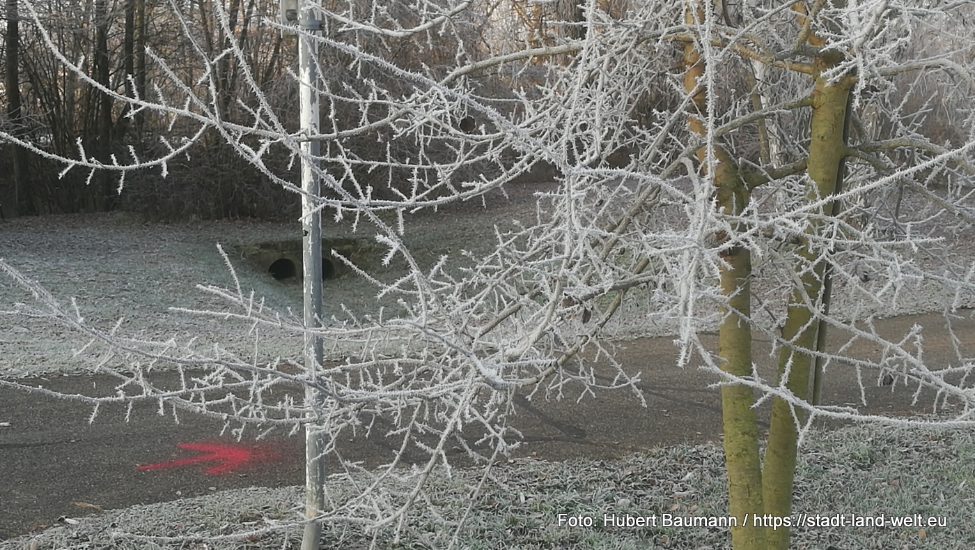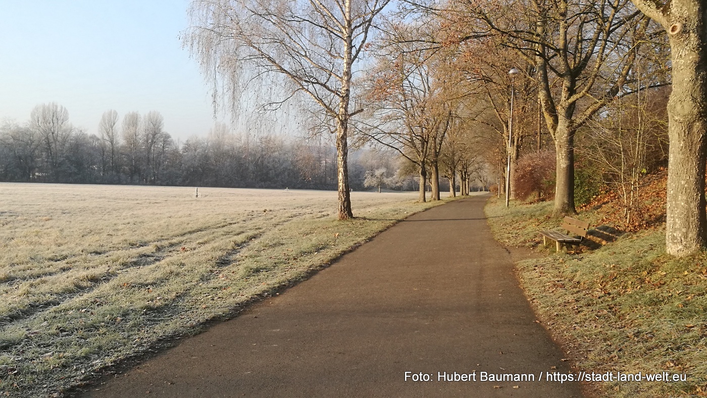 Der Weg von Festplatz bis zur Innenstadt ist ungefähr 1,5 km und dauert rund 20 Minuten. Man läuft ausschließlich im Grünen. An den Bildern sieht man sehr schön: Es war lausig kalt und so lag der Rauhreif auf Wiesen und Bäumen im Park. Auch die Nacht war recht frisch, was man innerhalb meiner mobilen vier Wände allerdings nicht merkt. Die kleinen Nachisolierungsmaßnahmen, die ich in den vergangenen Wochen vorgenommen habe, machen sich offensichtlich doch bemerkbar.