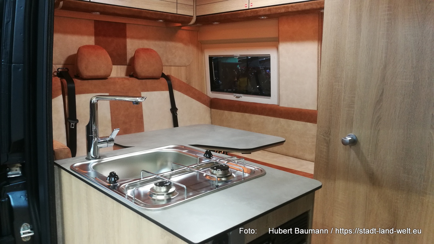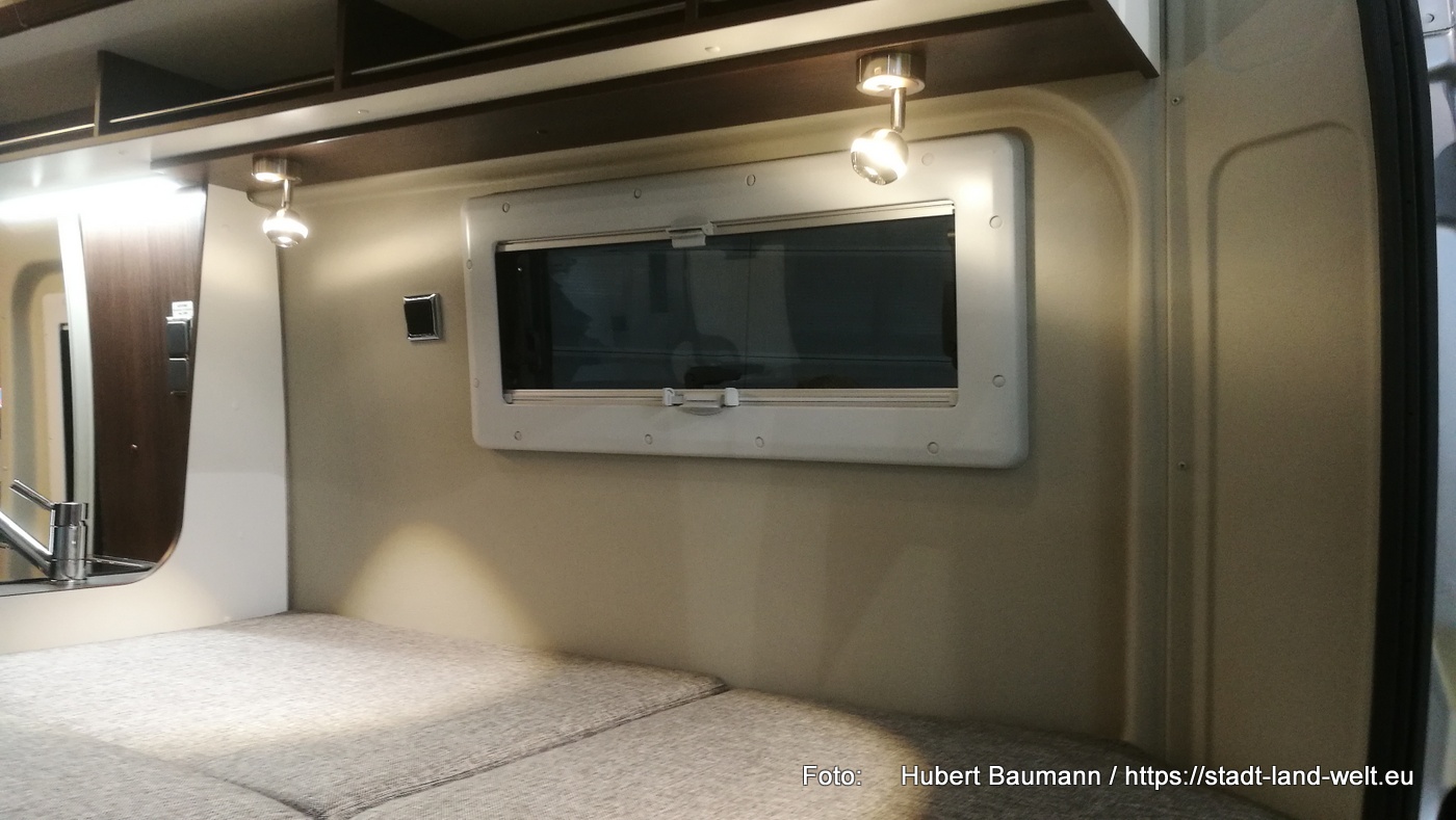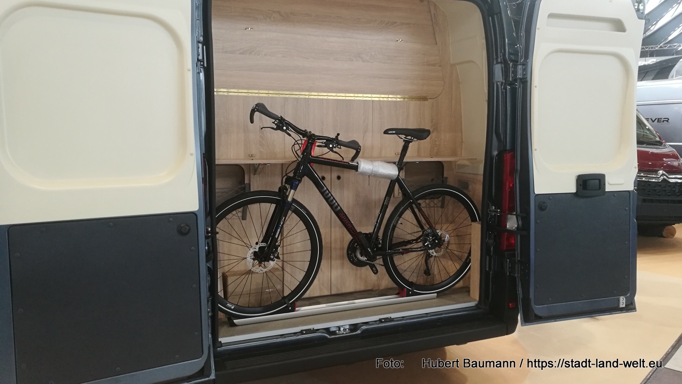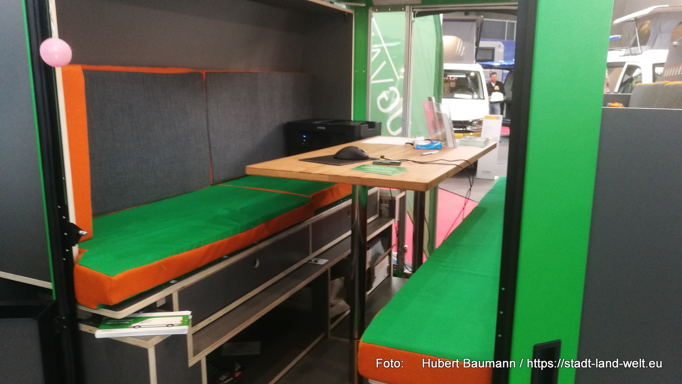 Den Kastenwagen mit Fahrrad im Heck fand ich auf dem Stand von Clever. Ebenfalls ein Fahrzeug mit 5, 40 m. Im vorderen Bereich des Fahrzeuges hat man eine Küche und eine großzügige Sitzgruppe.