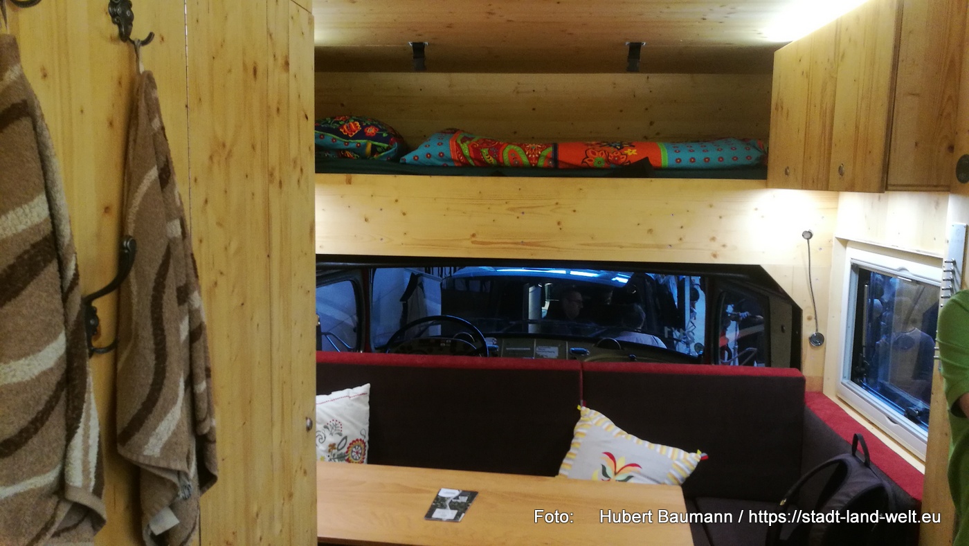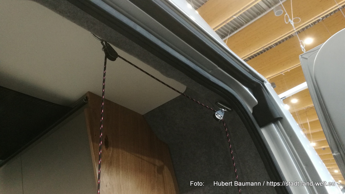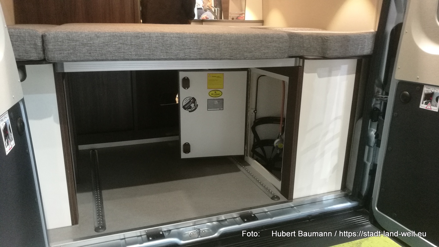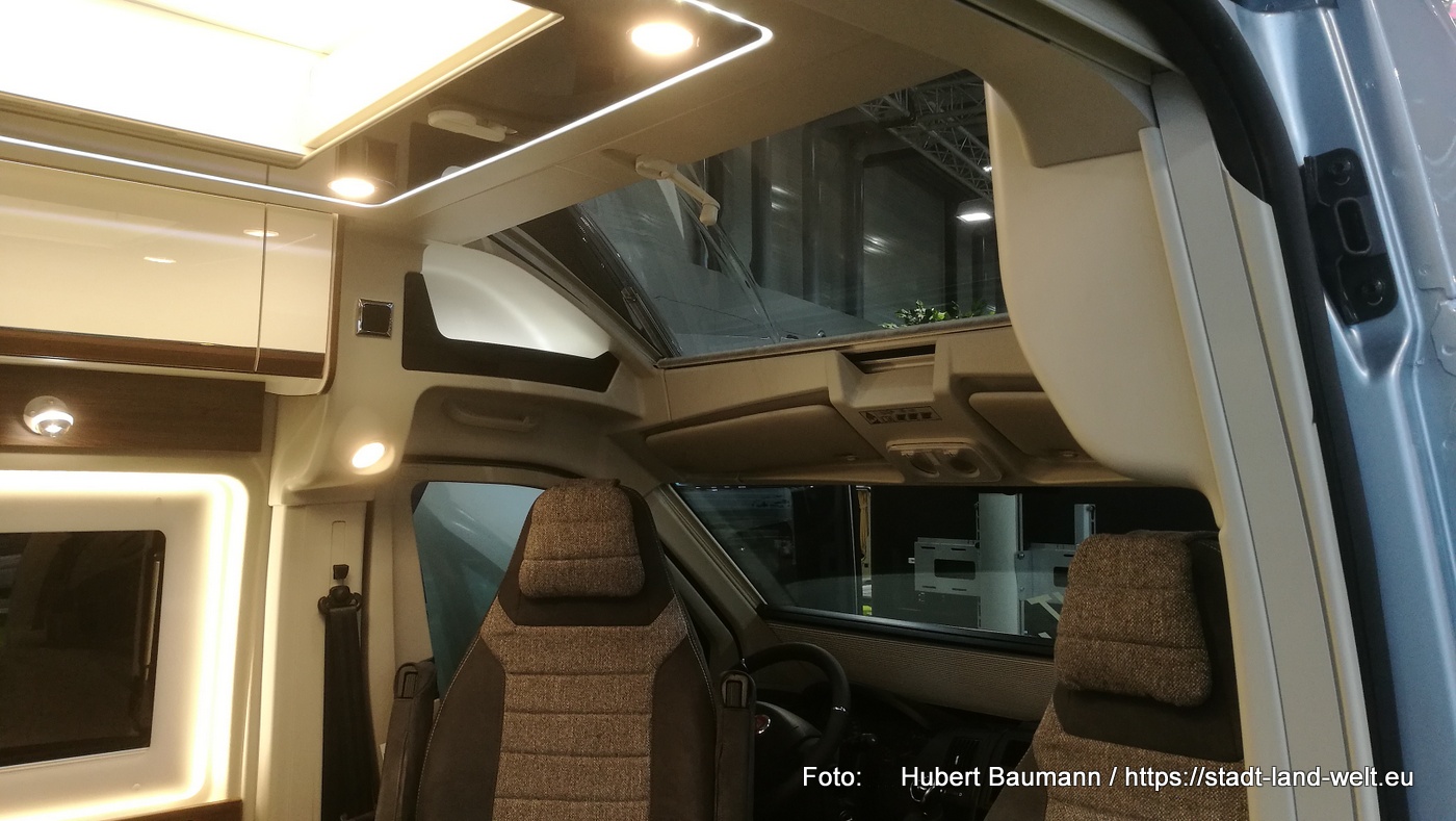Den Kastenwagen mit Fahrrad im Heck fand ich auf dem Stand von Clever. Ebenfalls ein Fahrzeug mit 5, 40 m. Im vorderen Bereich des Fahrzeuges hat man eine Küche und eine großzügige Sitzgruppe.