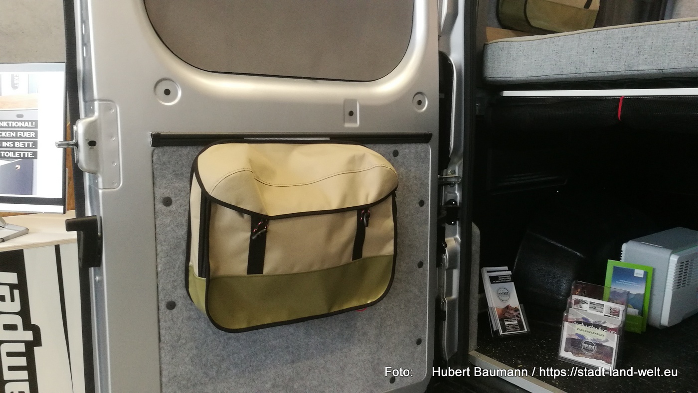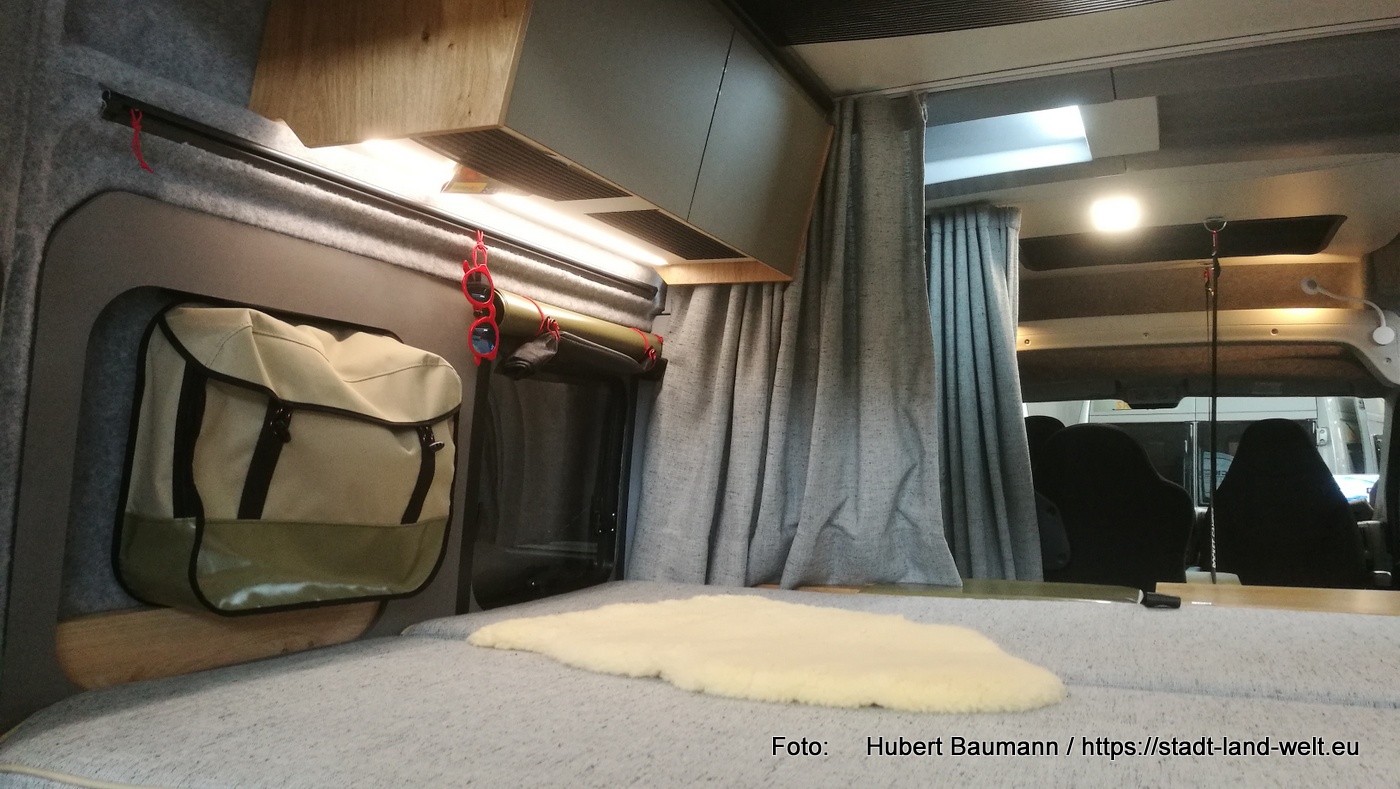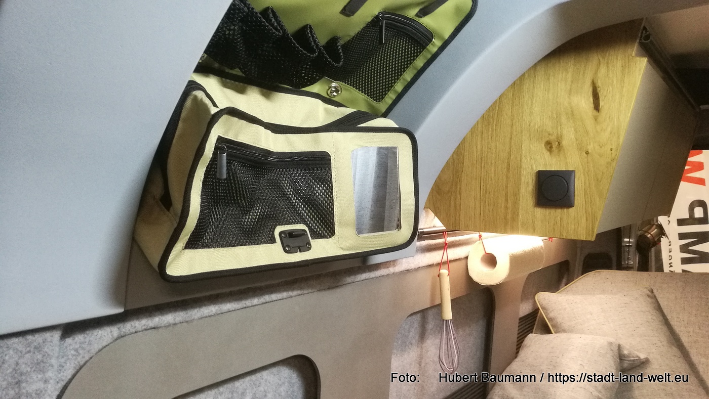 Ein Konzept ist praktisch gedacht und verzichtet auf überflüssigen Schnickschnack. Zum Duschen nutzt man die Außendusche. Die Toilette steckt in einer großen „Schublade“ unter dem Bett und für sein „großes Geschäft“ zieht man einfach die Vorhänge zu. Dafür gibt es viele praktische Taschen, die mit Kederschienen im Fahrzeug befestigt sind und die zu Hause zum Befüllen oder am Campingplatz zum Waschen gehen einfach komplett herausgenommen und mitgenommen werden können. Der Stauraum unter den Betten ist in voller Fahrzeugbreite nutzbar.